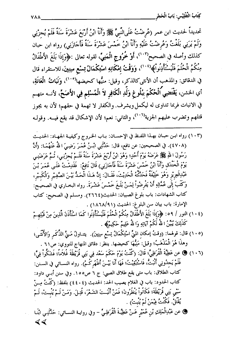 (¬103) رواه ابن حبان بهذا اللفظ في الإحسان: باب الخروج وكيفية الجهاد: الحديث (4708). في الصحيحين: عن نافع، قال: حَدَّثَنِى ابْنُ عُمَرَ رَضِىَ الله عَنْهُمَا: (أنَّ رَسُولَ الله عَرَضَهُ يومَ أُحُدٍ؛ وَهُوَ ابْنُ أربَعَ عَشرَةَ سَنَةَ فَلَم يُجِزْنِي، ثُمَّ عَرَضَنِي يَوْمَ الخَنْدَقِ وَأنَاْ ابنُ خَمْسَ عَشْرَةَ سَنَةَ فَأَجَازَني) قَالَ نَافِعٌ: فَقَدِمْتُ عَلَى عُمَرَ بنَ عَبْدِ الَعِزِيز وَهُوَ خَلِيفَةٌ فَحَدَّثتُهُ الحَديثَ، فَقَالَ: إِنَّ هَذَا الحَدُّ بَينَ الصَّغِيرِ وَالكبيرِ، وَكَتَبَ إِلَى عُمَّالِهِ أنْ يَفرِضُوا لِمَنْ بَلَغَ خَمْسَ عَشرَةَ. رواه البخاري في الصحيح: كتاب الشهادات: باب بلوغ الصبيان: الحديث (2664). ومسلم في الصحيح: كتاب الإمارة: باب بيان سن البلوغ: الحديث (91/ 1868).