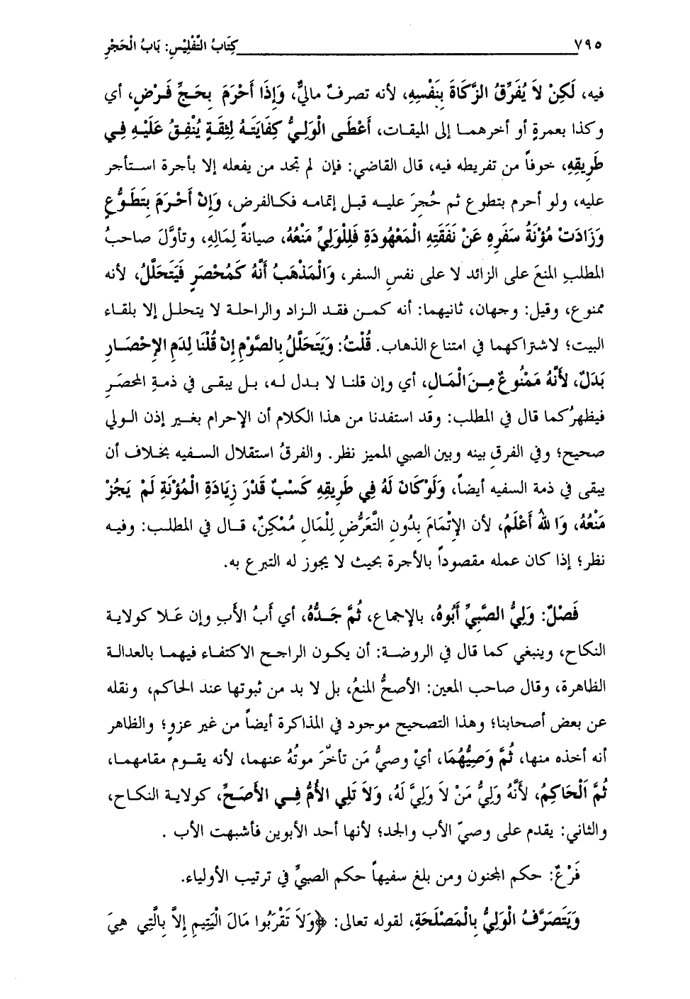 فيه، لَكِنْ لَا يُفَرِّقُ الزَّكَاةَ بِنفْسِهِ، لأنه تصرفٌ ماليٌّ، وِإذَا أَحْرَمَ بِحَجِّ فَرْضٍ، أي وكذا بعمرةٍ أو أخرهما إلى الميقات، أَعْطَى الْوَلِيُّ كِفَايَتَهُ لِثِقَةٍ يُنْفِق عَلَيْهِ في طَرِيقِهِ، خوفًا من تفريطه فيه، قال القاضي: فإن لم تجد من يفعله إلا بأجرة استأجر عليه، ولو أحرم بتطوع ثم حُجِرَ عليه قبل إتمامه فكالفرض، وِإدْ أَحْرَمَ بِتَطَوُّع وَزَادَتْ مُؤْنَةُ سَفَرِهِ عَنْ نَفَقَتِهِ الْمَعْهُودَةِ فَلِلْوَلِيِّ مَنْعُهُ، صيانةً لِمَالِهِ، وتأوَّلَ صاحِبُ المطلبِ المنعَ على الزائد لا على نفسِ السفو، وَالْمَذْهَبُ أَنهُ كَمُحْصَرٍ فَيَتَحَلَّلُ، لأنه ممنوع، وقيل: وجهان، ثانيهما: أنَّه كمن فقد الزاد والراحلة لا يتحلل إلا بلقاء البيت؛ لاشتراكهما في امتناع الذهاب. قُلْتُ: وَيتَحَلَّلُ بِالصوْمِ إِنْ قُلْنَا لِدَمِ الإِحْصَارِ بَدَلٌ، لأنَّهُ مَمْنُوع مِنَ الْمَالِ، أي وإن قلنا لا بدل له، بل يبقى في ذمةِ المحصَرِ فيظهرُ كما قال في المطلب: وقد استفدنا من هذا الكلام أن الإحرام بغير إذن الولي صحيح؛ وفي الفرقِ بينه وبين الصبي المميز نظر. والفرقُ استقلال السفيه بخلاف أن يبقى في ذمة السفيه أيضًا، وَلَوْ كَان لَهُ في طَرِيقِهِ كَسْبٌ قَدْرَ زِيَادَةِ الْمُؤْنَةِ لَمْ يَجُزْ مَنْعُهُ، وَالله أَعْلَمُ، لأن الإتْمَامَ بدُونِ التَّعَرُّضِ لِلْمَالِ مُمْكِنٌ، قال في المطب: وفيه نظر، إذا كان عمله مقصودًا بالَأجرة بحيث لا يجوز له التبرع به.