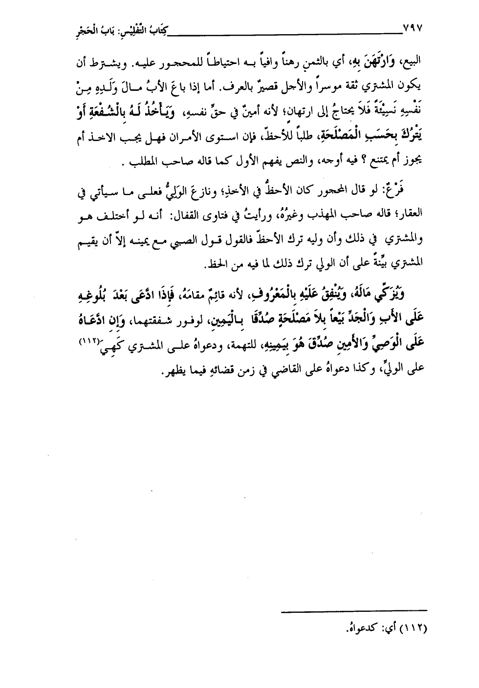 البيع، وَارْتَهَنَ بِهِ، أي بالثمن رهنًا وافيًا به احتياطًا للمحجور عليه. ويشترط أن يكون المشتري ثقة موسرًا والأجل قصيرٌ بالعرف. أما إذا باعَ الأبُ مالَ وَلَدِهِ مِنْ نَفْسِهِ نَسِيْئَة فَلَا يحتاجُ إلى ارتهانٍ؛ لأنه أمينٌ في حقِّ نفسهِ، وَيَأْخُذُ لَهُ بِالْشُفْعَةِ أَوْ يَتْرُكَ بِحَسَبِ الْمَصْلَحَةِ، طلبًا للأحظّ، فإن استوى الأمران فهل يجب الأخذ أم يجوز أم يمتنع؟ فيه أوجه، والنص يفهم الأول كما قاله صاحب المطلب.