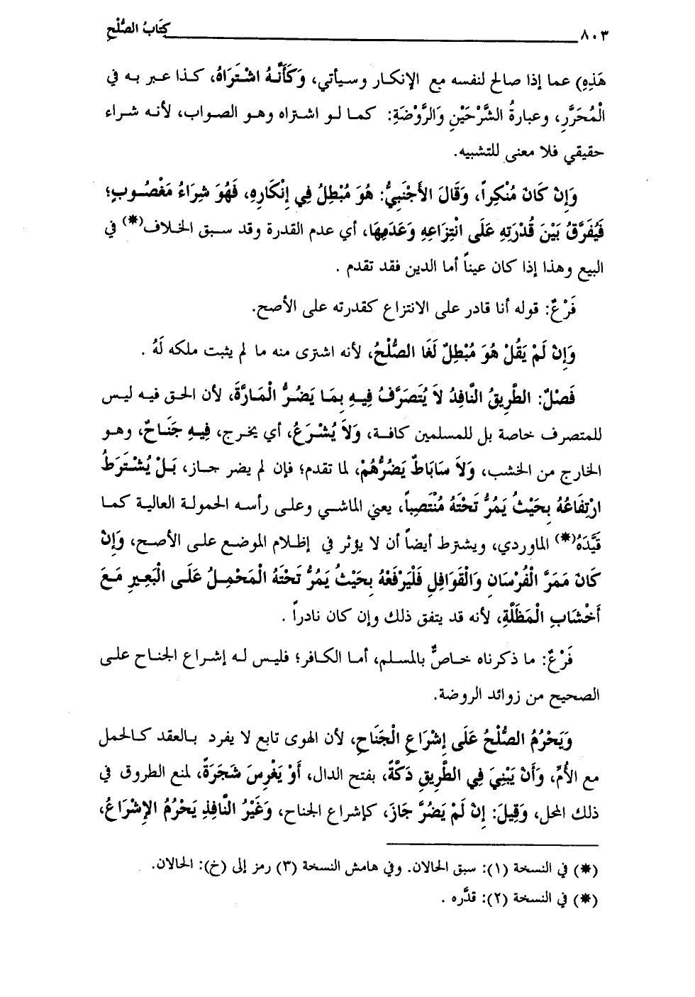 وَيَحْرُمُ الصُّلْحُ عَلَى إِشْرَاعِ الْجَنَاح، لأن الهوى تابع لا يفرد بالعقد كالحمل مع الأُمِّ، وَأَن يَبْنِيَ في الطَّرِيقِ دَكَّةَ، بفتح الدال، أَو يَغْرِسَ شَجَرَةَ، لمنع الطروق في ذلك المحل، وَقِيلَ: إِدْ لَمْ يَضُرُّ جَازَ، كإشراع الجناح، وَغَيْرُ النَّافِذِ يَحْرُمُ الإِشْرَاعُ،
