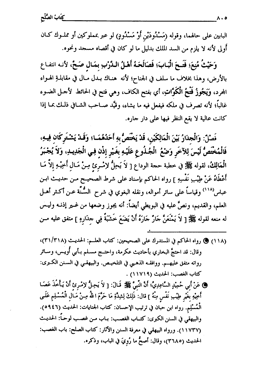 فَصلٌ: والجِدارُ بَينَ المَالِكينِ، قَدْ يَختَصُّ بِهِ أَحَدُهُما؛ وَقَد يَشْتَرِكانِ فِيهِ، فالمُختصُّ لَيسَ لِلآخَرِ وَضْعُ الجُذُوع عَلَيهِ بِغَيرِ إِذْنِ فِي الجَدِيدِ، وَلا يُجبَرُ المَالِكُ، لقوله - صلى الله عليه وسلم - في خطبة حجة الوداع [لا يَحِل لامْرِئٍ مِنْ مالِ أَخِيهِ إِلا ما أَعطاهُ عَنْ طِيبِ نَفسِهِ] رواه الحاكم بإسناد على شرط الصحيح من حديث ابن عباس (¬118) وقياسًا على سائر أمواله، ونفله البغوي في شرح السُّنَّة عن أكثر أهل العلم، والقديم، ونصَّ عليه في البويطي أيضًا: أنه يجوز وضعها من غير إذنه وليس له منعه لقوله - صلى الله عليه وسلم -[لا يَمْنَعَنُّ جارٌ جارَهُ أنْ يَضَعَ خَشَبَةً في جِدارِهِ] متفق عليه من