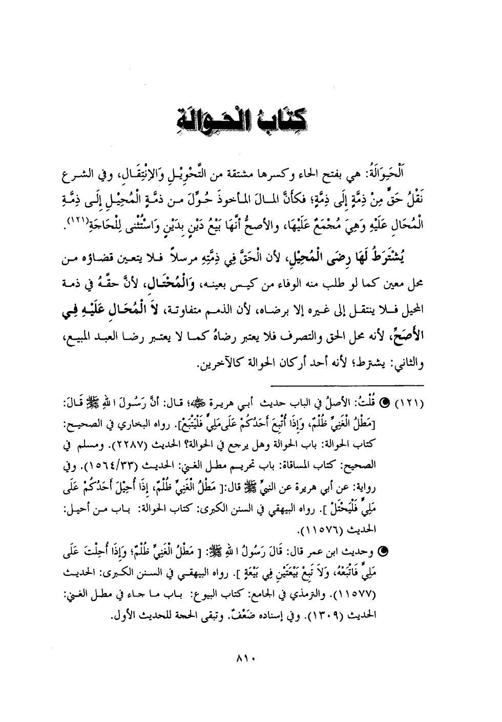 (¬121) * قُلْتُ: الأصلُ في الباب حديث أبي هريرة - رضي الله عنه -؛ قال: أن رَسُولَ اللهِ - صلى الله عليه وسلم - قَال: [مَطلُ الْغَنِي ظُلْمٌ، وَإِذا أتبِعَ أحَدُكُم عَلَى مَلِيٍّ فَليَتْبَع]. رواه البخاري في الصحيح: كتاب الحوالة: باب الحوالة وهل يرجع في الحوالة؟ الحديث (2287). ومسلم في الصحيح: كتاب المساقاة: باب تحريم مطل الغني: الحديث (33/ 1564). وفي رواية: عن أبي هريرة عن النبيِّ - صلى الله عليه وسلم - قال: [مَطلُ الْغَنِي ظُلْمٌ، إِذا أحِيلَ أحَدُكمُ عَلَى مَلِيٍّ فَلْيَحتَل]. رواه البيهقي في السنن الكبرى: كتاب الحوالة: باب من أحيل: الحديث (11576).