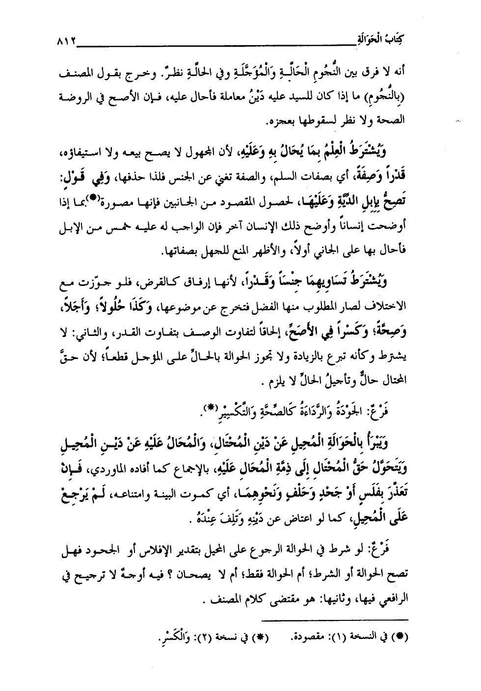 ويشْتَرَطُ العِلْمُ بِما يُحالُ بهِ وَعَلَيهِ، لأنَّ المجهول لا يصح بيعه ولا استيفاؤه، قَدرا وَصِفَة، أي بصفات السلم، والصفة تغني عن الجنس فلذا حذفها، وَفِي قَوْلٍ: تَصِحُّ بإبِلِ الديةِ وَعَلَيها، لحصول المقصود من الجانبين فإنها مصورة (•) بما إذا أوضحت إنسانًا وأوضح ذلك الإنسان آخر فإن الواجب له عليه خمس من الإبل فأحال بها على الجاني أولًا، والأظهر المنع للجهل بصفاتها.