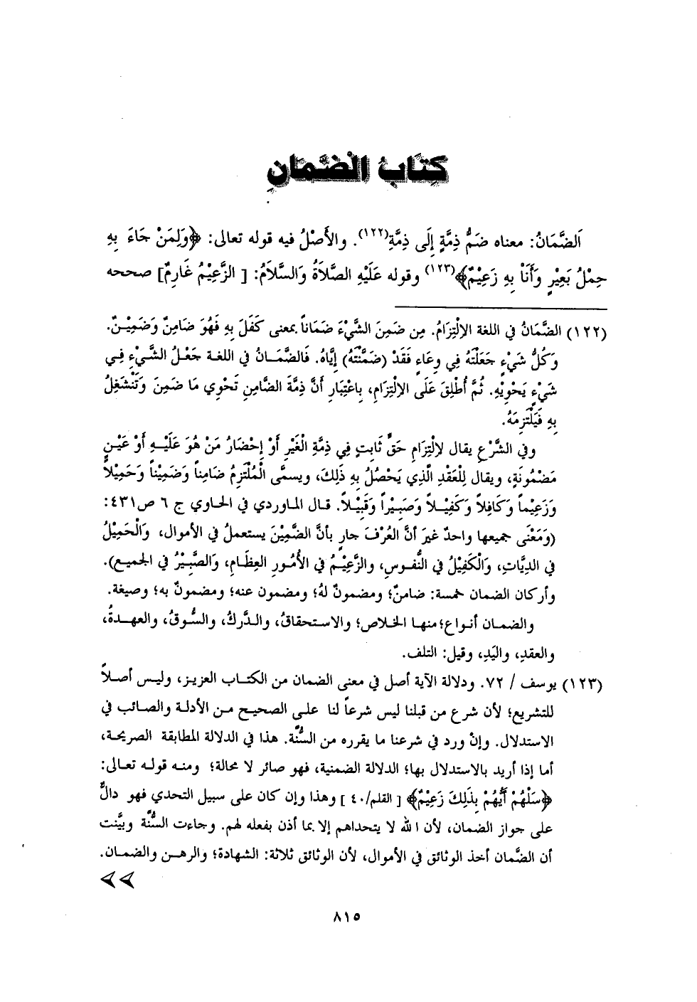 (¬122) الضمَانُ في اللغة الالتِزَامُ. مِن ضَمِنَ الشِّيء ضَمَانًا بمعنى كَفَلَ بِهِ فَهُوَ ضَامِن وَضَمِين. وَكُل شَيءٍ جَعَلتهُ فِي وعَاءٍ فَقَد (ضَمنتهُ) إياهُ. فَالضمَانُ في اللغة جعل الشيء فِي شَيء يَحويهِ. ثُمَّ أطلِقَ عَلَى الالتِزَامِ، بِاعتِبَارِ أن ذِمةَ الضامِنِ تَحوي مَا ضَمِنَ وَتَنشَغِل بِهِ فَيَلتزمَهُ.