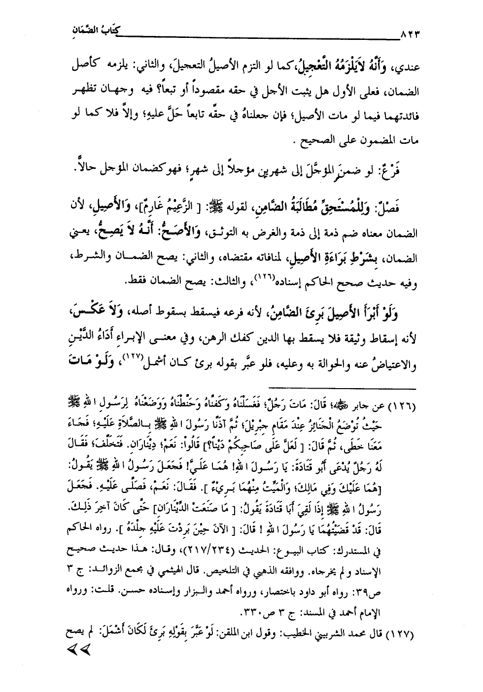 (¬126) عن جابر - رضي الله عنه -؛ قَال: مَاتَ رَجُل؛ فَغَسَلناهُ وَكَفناهُ وَحَنطناهُ وَوَضعنَاهُ لِرَسُولِ اللهِ - صلى الله عليه وسلم - حَيثُ تُوْضَعُ الجَنَائِزُ عِنْدَ مَقَامِ جبريلَ؛ ثُمَّ آذنا رَسُولَ اللهِ - صلى الله عليه وسلم - بِالصَّلاةِ عَلَيهِ؛ فَجَاءَ مَعَنَا خَطَى، ثُمَّ قَال: [لَعَلً عَلَى صَاحِبِكُم دَينًا؟ ] قَالُوا: نَعَم؛ دِينَارَانِ. فَتَخَلْفَ؛ فَقَال لَهُ رَجُلٌ يُدعَى أبو قَتَادَةَ: يَا رَسُولَ اللهِ! هُمَا عَلَيَّ! فَجَعَلَ رَسولُ اللهِ - صلى الله عليه وسلم - يَقُولُ: [هُمَا عَلَيكَ وَفِي مَالِكَ؛ وَالمَيِّتُ مِنهُمَا بَرِيء]. فَقَال: نَعَم، فَصَلَّى عَلَيهِ. فَجَعَلَ رَسُولُ الله - صلى الله عليه وسلم - إِذَا لَقِيَ أبَا قتَادَةَ يَقُولُ: [مَا صَنَعَتْ الدينَارَانِ] حَتى كَانَ آخِرَ ذَلِكَ. قَال: قد قَضَيتُهُمَا يَا رَسُولَ الله! قَال: [الآنَ حِينَ بَرِدتَ عَلَيهِ جِلْدَه]. رواه الحاكم في المستدرك: كتاب البيوع: الحديث (234/ 217)، وقال: هذا حديث صحيح الإسناد ولم يخرجاه. ووافقه الذهبي في التلخيص. قال الهيثمي في مجمع الزوائد: ج 3 ص 39: رواه أبو داود باختصار، ورواه أحمد والبزار وإسناده حسن. قلت: ورواه الإمام أحمد في المسند: ج 3 ص 330.