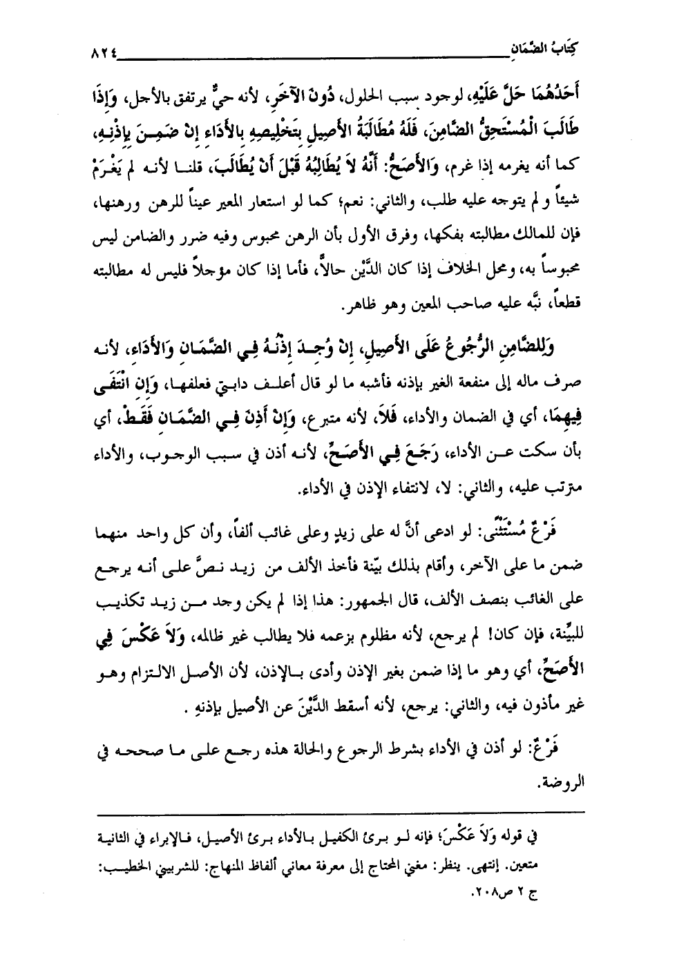 وَلِلضَّامِنِ الرُّجُوعُ عَلَى الأَصِيلِ، إِنْ وُجِدَ إِذْنُهُ فِي الضَّمَانِ وَالأَدَاءِ، لأنه صرف ماله إلى منفعة الغير بإذنه فأشبه ما لو قال أعلف دابتي فعلفها، وَإِنِ انْتَفَى فِيهِمَا، أي في الضمان والأداء، فَلَا، لأنه متبرع، وَإِنْ أَذِنَ فِي الضَّمَانِ فَقَطْ، أي بأن سكت عن الأداء، رَجَعَ فِي الأَصَحِّ، لأنه أذن في سبب الوجوب، والأداء مترتب عليه، والثاني: لا، لانتفاء الإذن في الأداء.