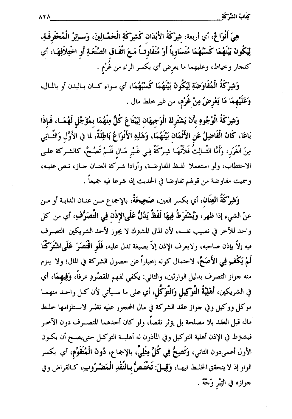 هِيَ أَنوَاعٌ، أي أربعة، شِرْكَةُ الأَبْدَانِ كَشِرْكَةِ الْحَمَّالِينَ، وَسائِرُ الْمُحْتَرِفَةِ، لِيَكُون بَينَهُمَا كَسْبُهُمَا مُتَسَاويًا أَو مُتَفَاوتًا مَعَ اتَّفَاقِ الصَّنْعَةِ أَو اختِلافِهَا، أي كنجار وخياط، وعليهما ما يعرِض أي بكسر الراء من غُرْمٍ.