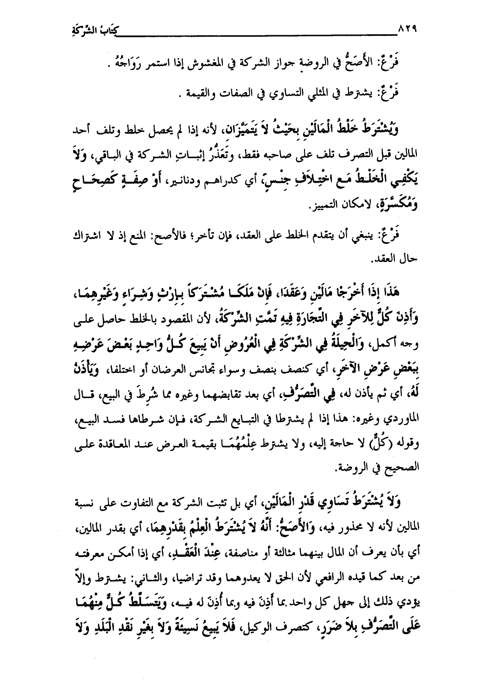 وَلَا يُشْتَرَطُ تَسَاوي قَدْرَ الْمَالينِ، أي بل تثبت الشركة مع التفاوت على نسبة المالين لأنه لا محذور فيه، وَالأَصَحُّ: أَنّهُ لَا يُشْتَرَطُ الْعِلْمُ بِقَدْرِهِمَا، أي بقدر المالين، أي بأن يعرف أن المال بينهما مثالثة أو مناصفة، عِنْدَ الْعَقْدِ، أي إذا أمكن معرفته من بعد كما قيده الرافعي لأن الحق لا يعدوهما وقد تراضيا، والثاني: يشترط وإلّا يؤدي ذلك إلى جهل كل واحد بما أَذِنَ فيه وبما أُذِنَ له فيه، وَيَتَسَلَّطُ كُلٌّ مِنْهُمَا عَلَى التَّصَرُّفِ بِلا ضَرَرٍ، كتصرف الوكيل، فَلَا يَبِيعُ نَسِيئَةً وَلَا بِغَيرِ نَقْدِ الْبَلَدِ وَلَا