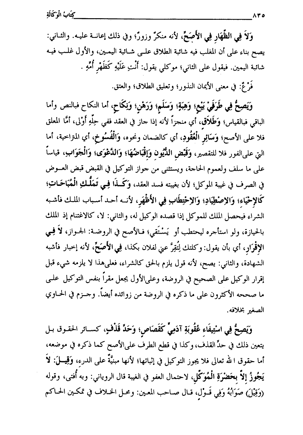 ويصِحُّ فِي اسْتِيفَاءِ عُقُوبَةِ آدَمِيٍّ كَقَصَاصٍ؛ وَحَدِّ قَذْفٍ، كسائر الحقوق بل يتعين ذلك في حدِّ القذف، وكذا في قطع الطرف على الأصح كما ذكره في موضعه، أما حقوق الله تعالى فلا يجوز التوكيل في إثباتها؛ لأنها مبنية على الدرءِ، وَقِيلَ: لَا يَجُوزُ إِلَّا بِحَضرةِ الْمُوَكلِ، لاحتمال العفو في الغيبة قال الروياني: وبه أُفتى، وقوله (وَقِيلَ) صَوَابُهُ وَفِي قَوْلٍ، قال صاحب العين: ومحل الخلاف في تمكين الحاكم
