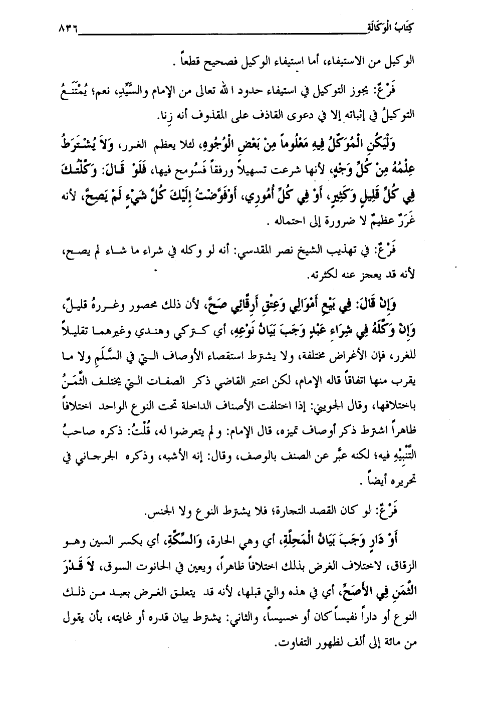 وَلْيَكُنِ الْمُوَكِّلُ فِيهِ مَعلُومًا مِنْ بَعْضِ الوُجُوهِ، لئلا يعظم الغرر، وَلَا يُشْتَرَطُ عِلْمُهُ مِنْ كُل وَجْه، لأنها شرعت تسهيلًا ورفقًا فَسُومح فيها، فَلَو قال: وَكْلتكَ فِي كُلِّ قَلِيلٍ وَكَثِيرِ، أَو فِي كُل أُمُورِي، أَوْ فَوَّضْتُ إِلَيكَ كُل شَيءٍ لَم يَصح، لأنه غَرَرٌ عظيمٌ لا ضرورة إلى احتماله.