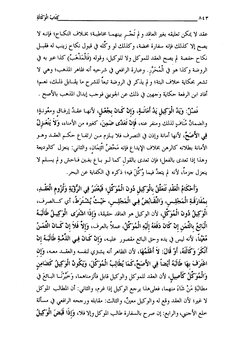 وَأَحْكَامُ الْعَقْدِ تَتَعَلَّقُ بِالْوَكِيلِ دُون الْمُوَكّلِ؛ فيعتَبَرُ فِي الرؤيةِ وَلُزُومِ العَقْدِ، بِمُفَارَقَةِ الْمَجْلِسِ، وَالتَّقَابُضُ فِي الْمَجْلِسِ، حَيثُ يُشْتَرَطُ، أي كالصرف، الْوَكِيلُ دُون الْمُوَكِّلِ، لأن الوكيل هو العاقد حقيقة، وإذَا اشتَرَى الْوَكيلُ طَالبَهُ الْبَائعُ بِالثمَنِ إِن كَان دَفَعَهُ إلَيهِ الْمُوَكّلُ، عملًا بالعرف، إلَّا إِن كان الثمَنُ مُعَينًا، لأنه ليس في يده وحق البائع مقصور عليه، وَإِن كان فِي الذّمّةِ طَالبَهُ إِن أَنْكَرَ وَكَالتَهُ، أوْ قَال: لَا أعْلَمُهَا، لأن الظاهر أنه يشتري لنفسه والعقد معه، وَإِنِ اعْتَرَفَ بِهَا طَالبَهُ أَيضًا فِي الأصَح، كَمَا يُطَالِبُ الْمُوَكّلَ، وَيَكُون الْوَكِيلُ كَضامِنٍ وَالْمُوَكلُ كَأصِيلٍ، لأن العقد للموكل والوكيل قابل فألزمناهما، وَخيَّرْنَا البائعَ في مطالبَةِ مَنْ شَاءَ منهما، فعلى هذا يرجع الوكيل إذا غرم، والثاني: أن المطالب الموكل لا غير؛ لأن العقد وقع له والوكيل معينٌ، والثالث: مقابله ورجحه الرافعي في مسألة خلع الأجنبي، والرابع: إن صرح بالسفارة طالب الموكل وإلا فلا، وَإذَا قَبَضَ الْوَكِيلُ