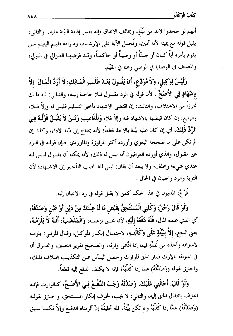 وَليس لِوَكِيلٍ، وَلَا مُوَدَّعٍ، أَن يَقُولَ بَعدَ طَلَبِ الْمالِكِ: لَا أَرُدُّ المال إلا بإِشْهاد فِي الأصَحِّ، لأن قوله في الرد مقبول فلا حاجة إليه، والثاني: له ذلك تحرزًا من الاختلاف، والثالث: إن اقتضى الإشهاد تأخير التسليم فليس له وإلّا فلا، والرابع: إن كان قبضها بالإشهاد فله وإلا فلا، وَللْغَاصِبِ وَمَنْ لَا يُقْبَلُ قَوْلُهُ فِي الرّدّ ذلِكَ، أي إن كان عليه بيّنة بالأخذ قطعًا؛ لأنه يحتاج إلى بيّنة الأداء، وكذا إن لم تكن على ما صححه البغوي وأورده أكثر المراوزة والماوردي فإن قوله في الرد غير مقبول، والذي أورده العراقيون أنه ليس له ذلك، لأنه يمكنه أن يقول ليس له عندى شيء؛ ويحلف؛ ولا يبعد أن يقال؛ ليس للغاصب التأخير إلى الإشهاد؛ لأن التوبة والرد واجبان في الحال.
