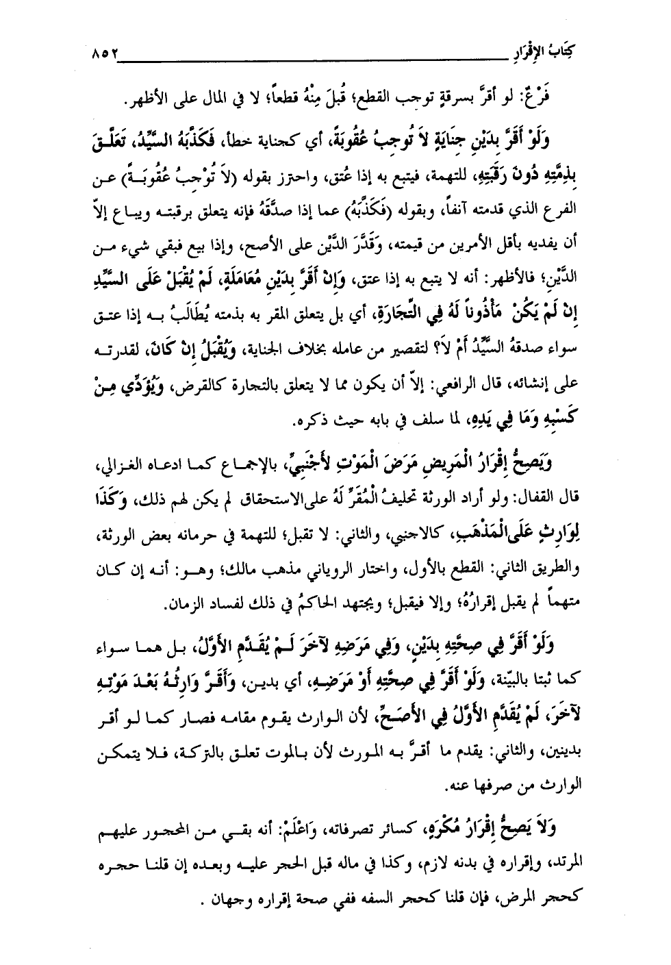 وَلَوْ أَقَرَّ بِدَينِ جِنَايَةٍ لَا تُوجِبُ عُقُوبَةً، أي كجناية خطأ، فَكَذَّبَه السَّيِّدُ، تَعَلقَ بِذِمتِهِ دُون رَقَبتِهِ، للتهمة، فيتبع به إذا عُتق، واحترز بقوله (لَا تُوْجِبُ عُقُوبَةً) عن الفرع الذي قدمته آنفًا، وبقوله (فَكَذبهُ) عما إذا صدَّقَهُ فإنه يتعلق برقبته ويباع إلّا أن يفديه بأقل الأمرين من قيمته، وَقَدَّرَ الدَّين على الأصح، وإذا بيع فبقى شيء من الدَّينِ؛ فالأظهر: أنه لا يتبع به إذا عتق، وَإنْ أَقَرَّ بِدَيْنِ مُعَامَلَةٍ، لَم يُقْبَل عَلَى السيدِ إِن لَم يَكُن مَأذُونا لهُ فِي التجارَةِ، أي بل يتعلق المقر به بذمته يُطَالبُ به إذا عتق سواء صدقهُ السيدُ أَم لَا؟ لتقصير من عامله بخلاف الجناية، ويقْبَلُ إِن كَان، لقدرته على إنشائه، قال الرافعي: إلّا أن يكون مما لا يتعلق بالتجارة كالقرض، ويؤدي مِنْ كَسبِهِ وَمَا فِي يَدِهِ، لما سلف في بابه حيث ذكره.
