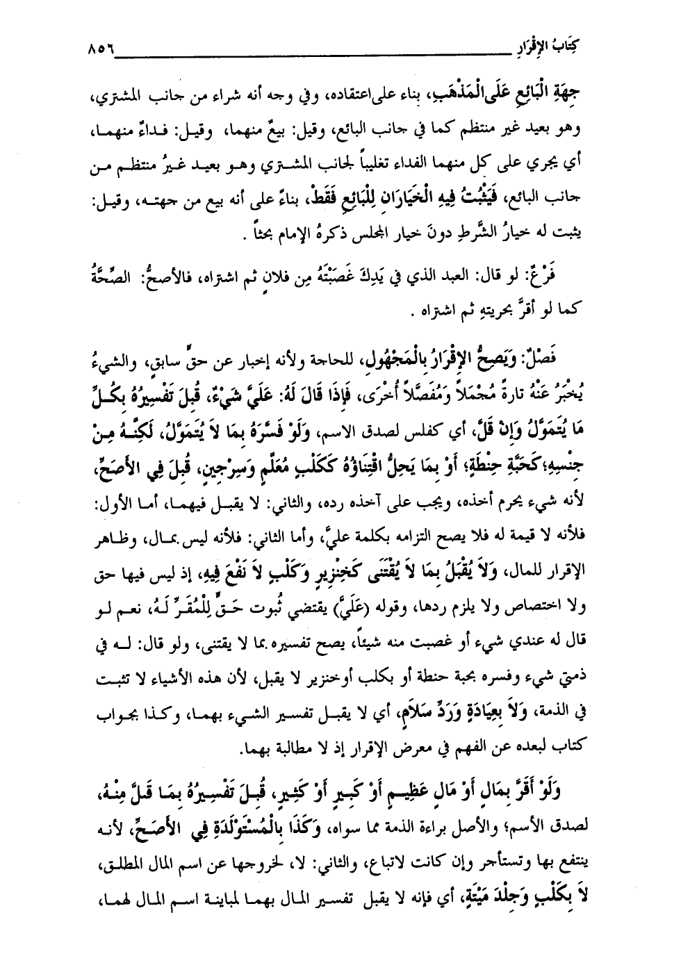 فَصْلٌ: وَيَصح الإقْرَارُ بِالمجهُولِ، للحاجة ولأنه إخبار عن حقّ سابقٍ، والشئُ يُخْبَرُ عَنْهُ تارةً مُجْمَلًا وَمُفَصَّلًا أُخْرَى، فَإذَا قَال لَهُ: عَلَي شَيء، قُبِلَ تَفْسِيرُهُ بكُل مَا يُتَمَوَّلُ وَإن قَلَّ، أي كفلس لصدق الاسم، وَلَوْ فَسرَهُ بِمَا لَا يُتمَوَّلُ، لَكنهُ مِنْ جِنْسِهِ؛ كَحَبَّةِ حِنْطَةٍ؛ أَوْ بِمَا يَحِلُّ اقْتِنَاؤهُ كَكَلبٍ مُعَلّمٍ وَسِرْجِينٍ، قُبِلَ فِي الأصَح، لأنه شيء يحرم أخذه، ويجب على أخذه رده، والثاني: لا يقبل فيهما، أما الأول: فلأنه لا قيمة له فلا يصح التزامه بكلمة علي، وأما الثاني: فلأنه ليس بمال، وظاهر الإقرار للمال، وَلَا يُقْبَلُ بِمَا لَا يُقْتَنَى كَخِنزِير وَكَلْب لَا نَفْعَ لِيهِ، إذ ليس فيها حق ولا اختصاص ولا يلزم ردها، وقوله (عَلَى) يقتضي ثُبوت حَقّ لِلْمُقَر لَهُ، نعم لو قال له عندي شيء أو غصبت منه شيئًا، يصح تفسيره بما لا يقتنى، ولو قال: له في ذمتى شيء وفسره بحبة حنطة أو بكلب أوخنزير لا يقبل، لأن هذه الأشياء لا تثبت في الذمة، وَلَا بِعِيَادَةٍ وَرَدِّ سَلامٍ، أي لا يقبل تفسير الشيء بهما، وكذا بجواب كتاب لبعده عن الفهم في معرض الإقرار إذ لا مطالبة بهما.