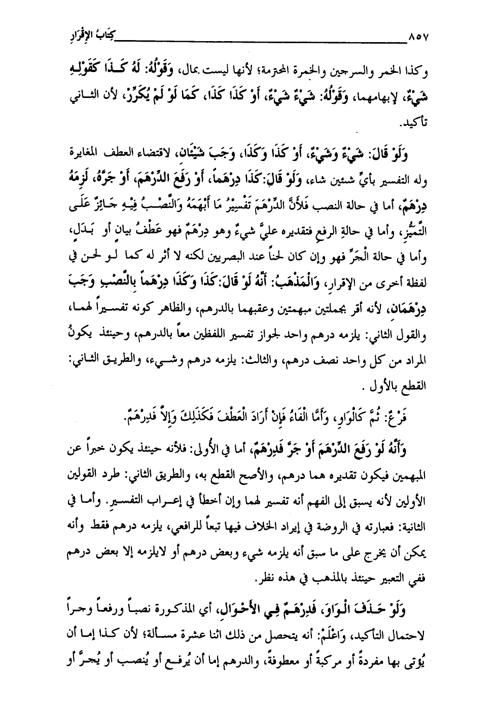 وَلَو قَال: شَيء وَشَيء، أَوْ كَذَا وَكَذَا، وَجَبَ شَيئَانِ، لاقتضاء العطف المغايرة وله التفسير بأيِّ شيئين شاء، وَلَو قَال: كَذَا دِرْهَما، أَو رَفع الدرهمَ، أَوْ جَرهُ، لَزِمَهُ دِرْهَم، أما في حالة النصب فَلأن الدِّرْهَمَ تَفْسِيرُ مَا أَبهَمَهُ وَالنصبُ فِيهِ جائِزٌ عَلَى التميزِ، وأما في حالةِ الرفع فتقديره عليَّ شيء وهو دِرْهَم فهو عَطْفُ بيان أو بَدَلٍ، وأما في حالة الجَر فهر وإن كان لحنًا عند البصريين لكنه لا أثر له كما لو لحن في لفظة أخرى من الإقرارِ، وَالمَذْهَبُ: أنهُ لَو قَال: كَذَا وَكَذَا دِرْهَما بِالنصبِ وَجَبَ دِرْهَمَانِ، لأنه أقر بجملتين مبهمتين وعقبهما بالدرهم، والظاهر كونه تفسيرًا لهما، والقول الثاني: يلزمه درهم واحد لجواز تفسير اللفظين معًا بالدرهم، وحينئذ يكونُ المراد من كل واحد نصف درهم، والثالث: يلزمه درهم وشيء، والطريق الثاني: القطع بالأول.