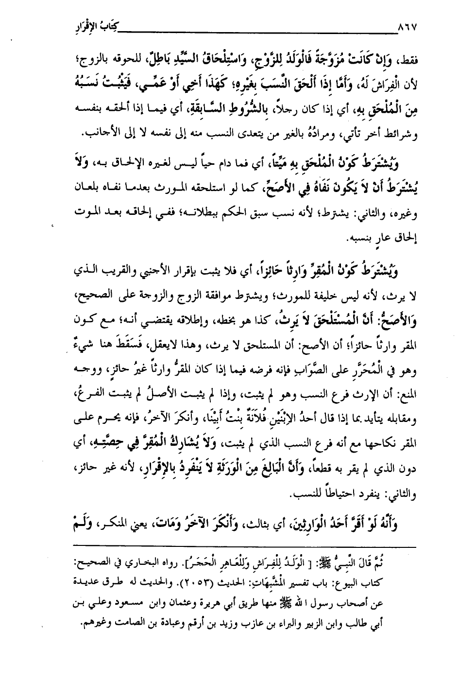 ويُشْتَرَطُ كَوْنُ الْمُقِرِّ وَارِثًا حَائِزًا، أي فلا يثبت بإقرار الأجنبي والقريب الذي لا يرث, لأنه يشير خليفة للمورث؛ ويشترط موافقة الزوج والزوحة على الصحيح، وَالأصَحُّ: أَنَّ الْمُسْتَلْحَقَ لا يَرِثُ، كذا هو بخطه، وإطلاقه يقتضي أنَّه؛ مع كون المقر وارثًا حائزًا؛ أن الأصح: أن المستلحق لا يرث، وهذا لا يعقل، فَسَقَطَ هنا شيء وهو في الْمُحَرَّر على الصَّوَابِ فإنَّه فرضه فيما إذا كان المقرُّ وارثًا غيرُ حائزٍ، ووجه المنع: أن الإرث فرع النسب وهو لم يثبت، وإذا لم يثبت الأصلُ لم يثبت الفرعُ، ومقابله يتَأيد بما إذا قال أحدُ الابْنَينِ فُلَانَةٌ بِنْتُ أَبِينَا، وأنكرَ الآخرُ، فإنَّه يحرم على المقر نكاحها مع أنَّه فرع النسب الذي لم يثبت، وَلَا يُشَارِكُ الْمُقِرَّ في حِصَّتِهِ، أي دون الذي لم يقر به قطعًا، وَأَنَّ الْبَالِغَ مِنَ الْوَرَثَةِ لا يَنْفَرِدُ بِالإِقْرَارِ, لأنه غير حائز، والثاني: ينفرد احتياطًا للنسب.