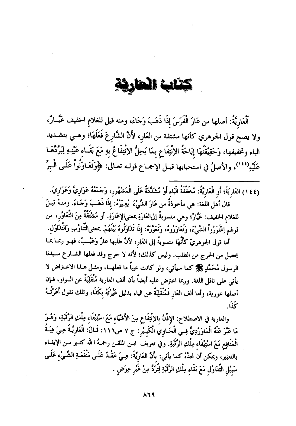 (¬144) العَارِيَةُ؛ أو الْعَارِيَّةُ: مُخَفَّفَةُ الْيَاء أوْ مُشَدَّدَةٌ عَلَى الْمَشهُورِ، وَجَمْعُهُ عَوَارِيّ وَعَوَارِيّ.