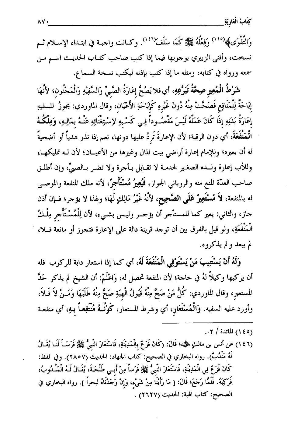 وَلَهُ أَن يَسْتَنِيبَ مَنْ يَسْتَوْفِي الْمَنْفَعَةَ لَهُ، أي كما إذا استعار دابة للركوب فله أن يركبها وكيلًا لهُ في حاجة؛ لأن المنفعة تحصل له، وَاعْلَمْ: أن الشيخ لم يذكر حَدَّ المستعيرِ، وقال الماوردي: كُلُّ مَنْ صَح مِنْهُ قُبُولُ الْهِبَةِ صَحَّ مِنْهُ طَلَبَهَا وَمَنْ لا فَلَا، وأورد عليه السفيه. وَالْمُسْتَعَارِ، أي وشرط المستعار، كَوْنُهُ مُنْتَفِعًا بِهِ، أي منفعة