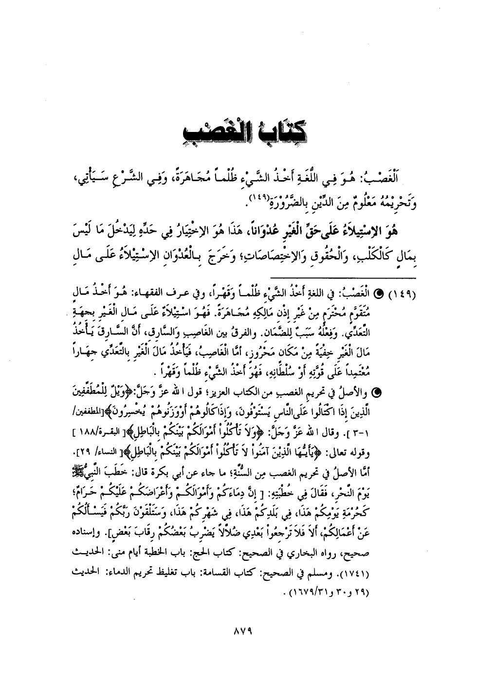 * والأصلُ في تحريمِ الغصبِ من الكتاب العزير؛ قول الله عزَّ وَجَلَّ: {وَيلٌ لِلْمُطَفِّفِينَ الَّذِينَ إِذَا اكْتَالُوا عَلَى النَّاسِ يَسْتَوْفُونَ وَإِذَا كَالُوهُمْ أَوْ وَزَنُوهُمْ يُخْسِرُونَ} [المطففين / 1 - 3]. وقال الله عَزَّ وَجَلَّ: {وَلَا تَأْكُلُوا أَمْوَالكُمْ بَينَكُمْ بِالْبَاطِلِ} [البقرة / 188] وقوله تعالى: {يَا أَيُّهَا الَّذِينَ آمَنُوا لَا تَأْكُلُوا أَمْوَالكُمْ بَينَكُمْ بِالْبَاطِلِ} [النساء / 29]. أمَّا الأصلُ في تحريم الغصب مِن السُّنَّةِ؛ ما جاء عن أبي بكرَة قال: خَطَبَ النَّبِيُّ - صلى الله عليه وسلم - يَوْمَ النَّحْرِ، فَقَال فِي خُطْبَتِهِ: [إِنَّ دِمَاءَكُمْ وَأَمْوَالكُمْ وَأَعْرَاضَكُمْ عَلَيكُمْ حَرَامٌ؛ كَحُرْمَةِ يَوْمِكُمْ هَذَا، فِي بَلَدِكُمْ هَذَا، فِي شَهْرِكُمْ هَذَا، وَسَتَلْقَوْنَ رَبَّكُمْ فَيَسْأَلُكُمْ عَنْ أَعْمَالِكُمْ، أَلا فَلَا تَرْجِعُوا بَعْدِي ضُلَّالًا يَضْرِبُ بَعْضُكُمْ رِقَابَ بَعْضٍ]. وإسناده صحيح، رواه البخاري في الصحيح: كتاب الحج: باب الخطة أيام منى: الحديث (1741). ومسلم في الصحيح: كتاب القسامة: باب تغليظ تحريم الدماء: الحديث (29 و 30 و 31/ 1679).