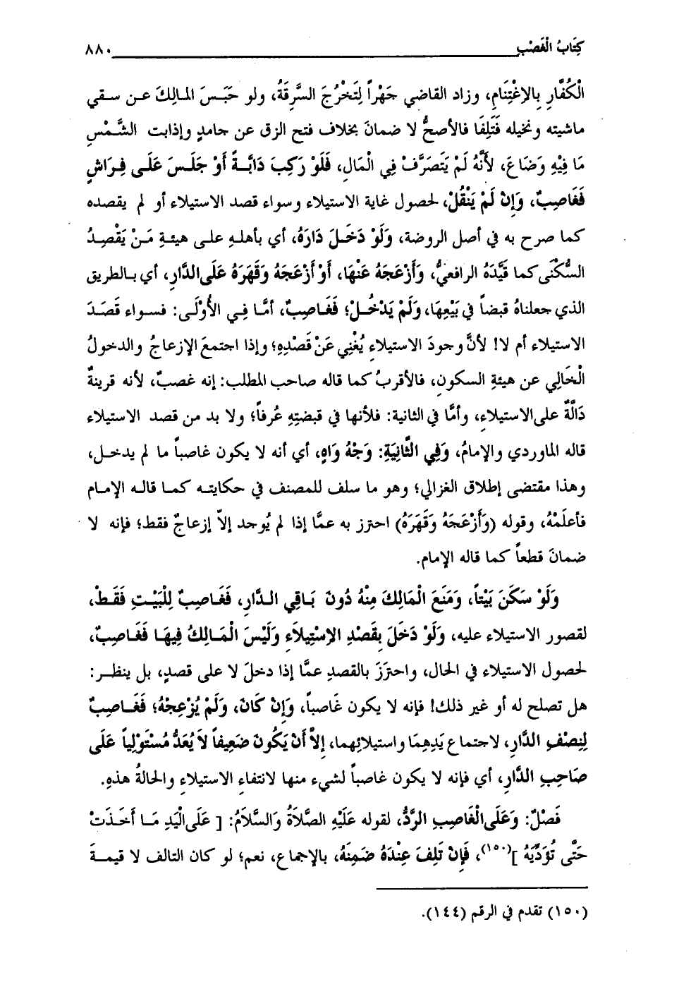 الْكُفَّارِ بِالاغْتِنَامِ، وزاد القاضي جَهْرًا لِتَخْرُجَ السَّرِقَةُ، ولو حَبَسَ المالِكَ عن سقي ماشيته ونخيله فَتَلِفَا فالأصحُّ لا ضمانَ بخلاف فتح الزق عن جامدٍ وإذابت الشَّمْسِ مَا فِيهِ وَضَاعَ، لأَنَّهُ لَمْ يَتَصَرَّفْ فِي الْمَالِ، فَلَوْ رَكِبَ دَابَّةً أَوْ جَلَسَ عَلَى فِرَاشٍ فَغَاصِبٌ، وَإِنْ لَمْ يَنْقُلْ، لحصول غاية الاستيلاء وسواء قصد الاستيلاء أو لم يقصده كما صرح به في أصل الروضة، وَلَوْ دَخَلَ دَارَهُ، أي بأهلهِ على هيئةِ مَنْ يَقْصِدُ السُّكْنَى كما قَيَّدَهُ الرافعيُّ، وَأَزْعَجَهُ عَنْهَا، أَوْ أَزْعَجَهُ وَقَهَرَهُ عَلَى الدَّارِ، أي بالطريق الذي جعلناهُ قبضًا في بَيعِهَا، وَلَمْ يَدْخُلْ؛ فَغَاصِبٌ، أمَّا فِي الأُوْلَى: فسواء قَصَدَ الاستيلاء أم لا! لأنَّ وجودَ الاستيلاءِ يُغْنِي عَنْ قَصْدِهِ؛ وإذا اجتمعَ الإزعاجُ والدخولُ الْخَالِي عن هيئةِ السكونِ، فالأقربُ كما قاله صاحب المطلب: إنه غصبٌ، لأنه قرينةٌ دَالَّةٌ على الاستيلاءِ، وأمَّا في الثانية: فلأنها في قبضتِهِ عُرفًا؛ ولا بد من قصد الاستيلاء قاله الماوردي والإمامُ، وَفِي الثَّانِيَةِ: وَجْهُ وَاهٍ، أي أنه لا يكون غاصبا ما لم يدخل، وهذا مقتضى إطلاق الغزالي؛ وهو ما سلف للمصنف في حكايته كما قاله الإمام فأعلَمْهُ، وقوله (وَأَزْعَجَهُ وَقَهَرَهُ) احترز به عمَّا إذا لم يُوجد إلّا إزعاجٌ فقط؛ فإنه لا ضمانَ قطعًا كما قاله الإمام.