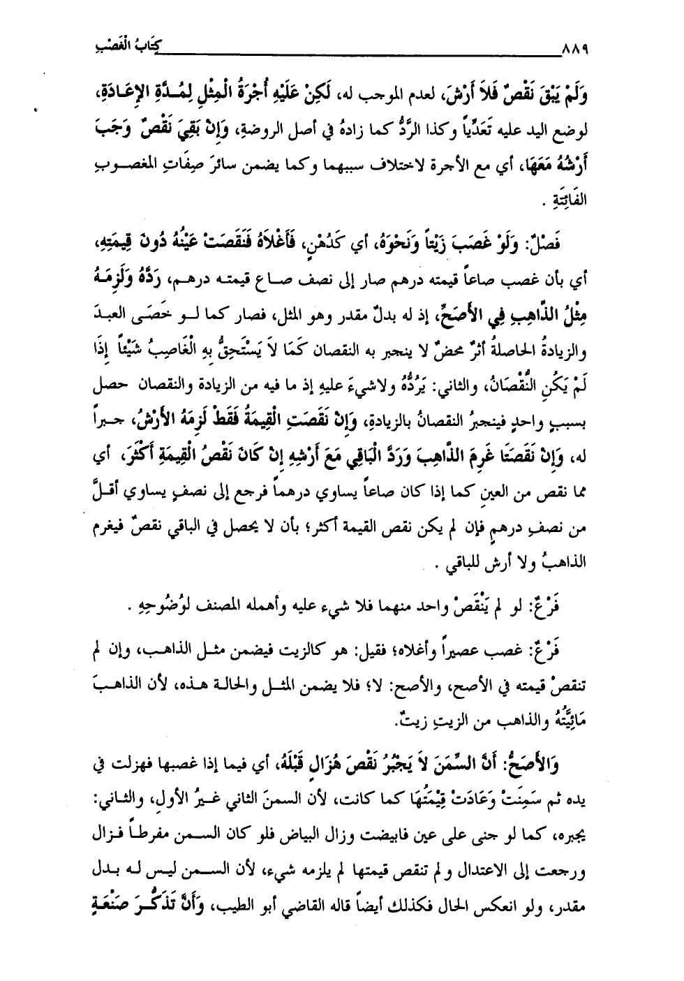 فَصْلٌ: وَلَوْ غَصَبَ زيتًا وَنَحْوَهُ، أي كَدُهْنٍ، فَأَغْلاهُ فَنَقَصَتْ عَينُهُ دُون قِيمَتِهِ، أي بأن غصب صاعًا قيمته درهم صار إلى نصف صاع قيمته درهم، رَدَّهُ وَلَزِمَهُ مِثْلُ الذَّاهِبِ فِي الأصَحِّ، إذ له بدلٌ مقدر وهو المثل، فصار كما لو خَصَى العبدَ والزيادةُ الحاصلةُ أثرٌ محضٌ لا ينجبر به النقصان كَمَا لَا يَسْتَحِقُّ بِهِ الْغَاصِبُ شَيئًا إِذَا لَمْ يَكُنِ النُّقْصَانُ، والثاني: يَرُدُّهُ ولا شيءَ عليهِ إذ ما فيه من الزيادة والنقصان حصل بسببٍ واحدٍ فينجبرُ النقصانُ بالزيادةِ، وَإِن نَقَصَتِ الْقِيمَةُ فَقَطْ لَزِمَهُ الأرْش، جبرًا له، وَإن نَقَصَتَا غَرِمَ الذَّاهِبَ وَرَدَّ الْبَاقِي مَعَ أرْشِهِ إِن كان نَقْصُ الْقِيمَةِ أَكْثَرَ، أي مما نقص من العينِ كما إذا كان صاعًا يساوي درهمًا فرجع إلى نصفٍ يساوي أقلَّ من نصفِ درهمٍ فإن لم يكن نقص القيمة أكثر؛ بأن لا يحصل في الباقي نقصٌ فيغرم الذاهبُ ولا أرش للباقي.