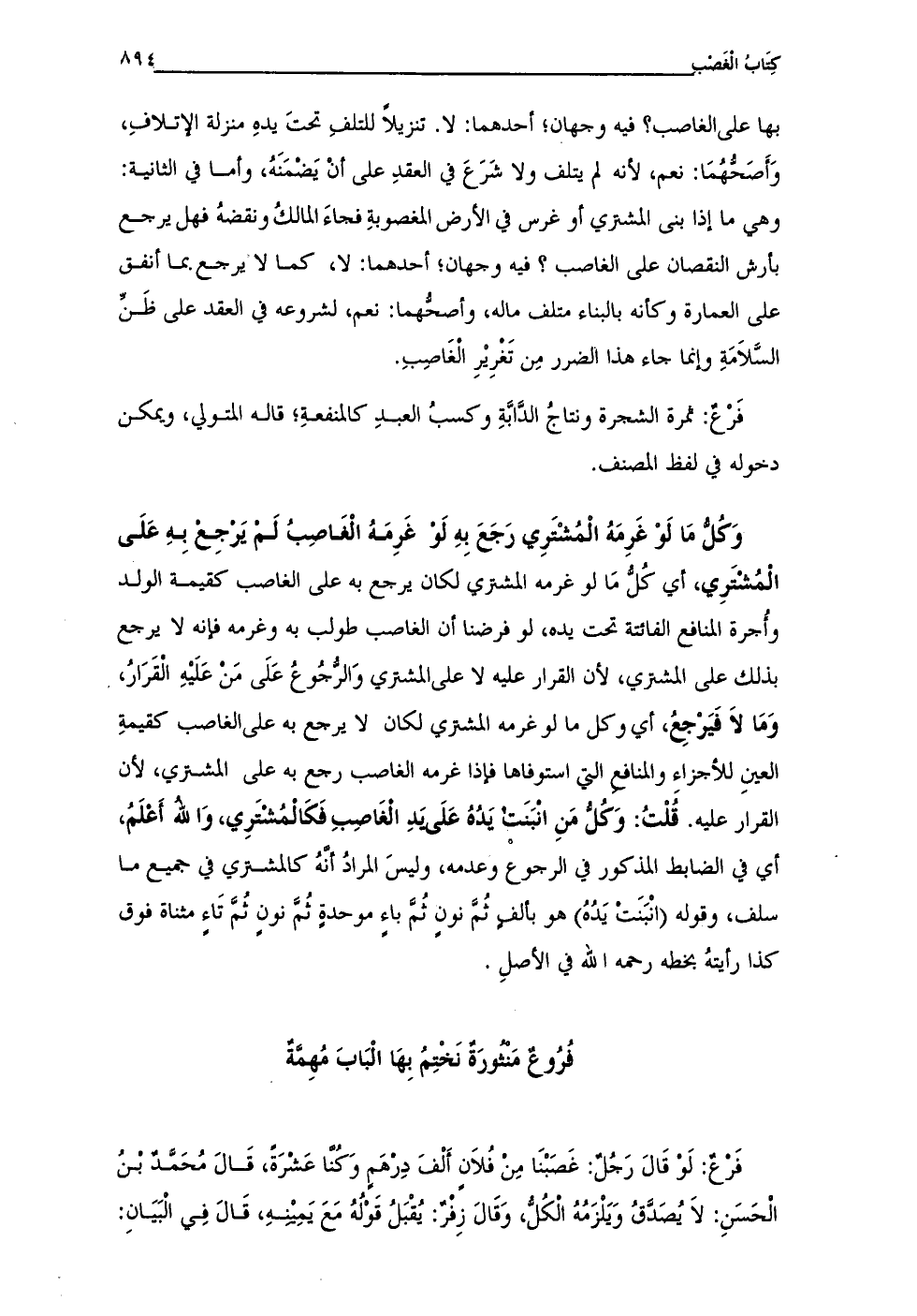 وَكُلُّ مَا لَوْ غَرِمَهُ الْمُشْتَرِي رَجَعَ بِهِ لَوْ غَرِمَهُ الْغَاصِبُ لَمْ يَرْجِعْ بِهِ عَلَى الْمُشْتَرِي، أي كُلُّ مَا لو غرمه المشتري لكان يرجع به على الغاصب كقيمة الولد وأُجرة المنافع الفائتة تحت يده، لو فرضنا أن الغاصب طولب به وغرمه فإنه لا يرجع بذلك على المشتري، لأن القرار عليه لا على المشتري وَالرُّجُوعُ عَلَى مَنْ عَلَيهِ الْقَرَارُ، وَمَا لَا فَيَرْجِعُ، أي وكل ما لو غرمه المشتري لكان لا يرجع به على الغاصب كقيمةِ العينِ للأجزاءِ والمنافع التي استوفاها فإذا غرمه الغاصب رجع به على المشتري، لأن القرار عليه. قُلْتُ: وَكُلُّ مَنِ انْبَنَتْ يَدُهُ عَلَى يَدِ الْغَاصِبِ فَكَالْمُشْتَرِي، وَالله أَعْلَمُ، أي في الضابط المذكور في الرجوع وعدمه، وليسَ المرادُ أنَّهُ كالمشتري في جميع ما سلف، وقوله (انْبَنَتْ يَدُهُ) هو بألفٍ ثُمَّ نونٍ ثُمَّ باءٍ موحدةٍ ثُمَّ نونٍ ثُمَّ تَاءٍ مثناة فوق كذا رأيتهُ بخطه رحمه الله في الأصلِ.