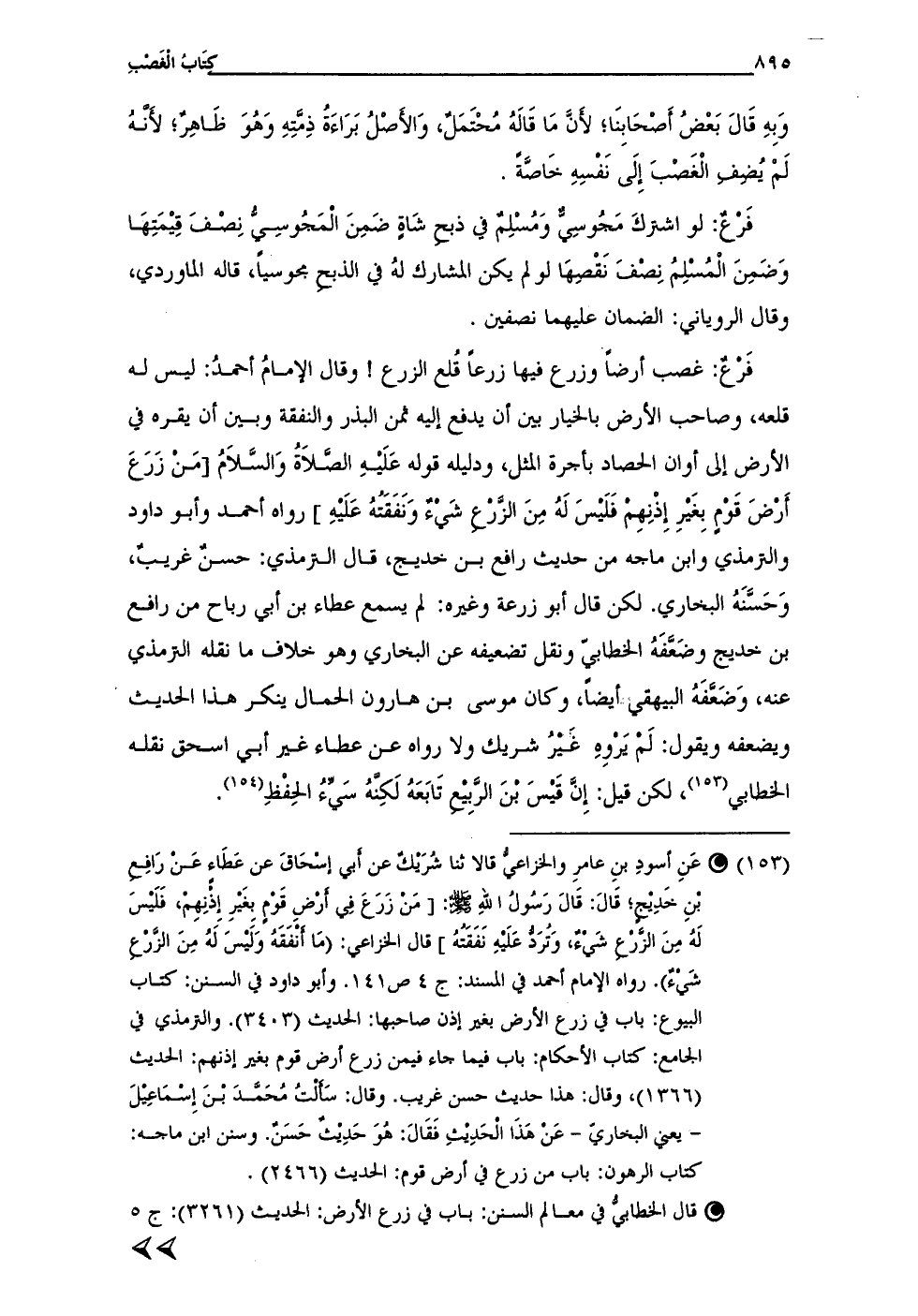 (¬153) * عَنِ أسودِ بن عامرِ والخزاعيُّ قالا ثنا شُرَيكٌ عن أَبي إسْحَاقَ عن عَطَاء عَنْ رَافِع بْنِ خَدِيجٍ؛ قَال: قَال رَسُولُ الله - صلى الله عليه وسلم -: [مَنْ زَرَعَ في أرْض قَوْمٍ بِغَيرِ إِذْنِهِمْ، فَلَيسَ لَهُ مِنَ الزَّرْعِ شَيءٌ، وَتُرَدُّ عَلَيهِ نَفَقَتُهُ] قال الخزاعي: (مَا أَنْفَقَهُ وَلَيسَ لَهُ مِنَ الزَّرْعِ شَيءٌ). رواه الإمام أحمد في المسند: ج 4 ص 141. وأبو داود في السنن: كتاب البيوع: باب في زرع الأرض بغير إذن صاحبها: الحديث (3403). والترمذي في الجامع: كتاب الأحكام: باب فيما جاء فيمن زرع أرض قوم بغير إذنهم: الحديث (1366)، وقال: هذا حديث حسن غريب. وقال: سَأَلْتُ مُحَمَّدَ بْنَ إِسْمَاعِيلَ -يعني البخاريّ- عَنْ هَذَا الْحَدِيثِ فَقَال: هُوَ حَدِيثٌ حَسَنٌ. وسنن ابن ماجه: كتاب الرهون: باب من زرع في أرض قوم: الحديث (2466).