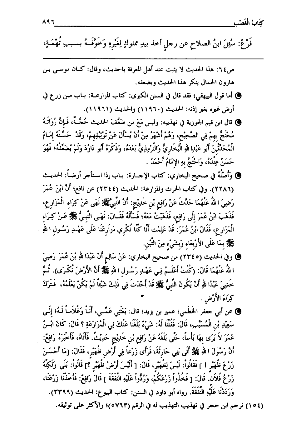 • وفي الحديث (2345) من صحيح البخاري: عَنْ سَالِمٍ أَنْ عَبْدَا لله بْنَ عُمَرَ رَضِيَ الله عَنْهُمَا قَال: (كُنْتُ أَعْلَمُ في عَهْدِ رَسُولِ الله - صلى الله عليه وسلم - أَنَّ الأَرْضَ تُكْرَى). ثُمَّ خَشِيَ عَبْدُا للهِ أَنْ يَكُونَ النَّبِيُّ - صلى الله عليه وسلم - قَدْ أَحْدَثَ فِي ذَلِكَ شَيئًا لَمْ يَكُنْ يَعْلَمُهُ، فَتَرَكَ كِرَاءَ الأَرْضِ.