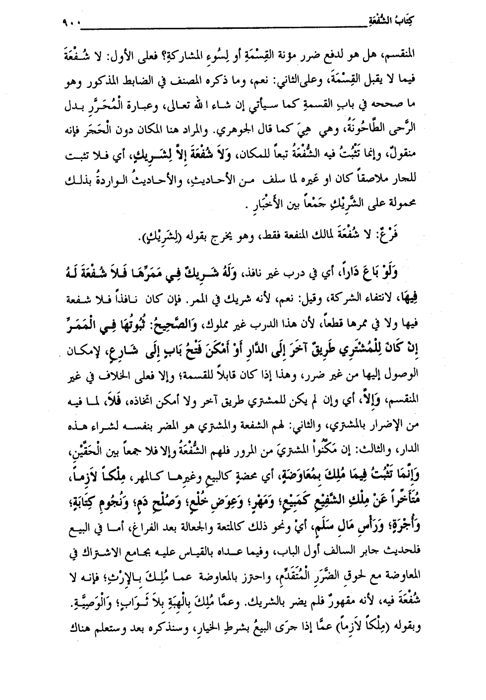 المنقسم، هل هو لدفع ضرر مؤنة القِسْمَةِ أو لِسُوءِ المشاركةِ؟ فعلى الأول: لا شُفْعَةَ فيما لا يقبل القِسْمَةَ، وعلى الثاني: نعم، وما ذكره المصنف في الضابط المذكور وهو ما صححه في بابِ القسمةِ كما سيأتي إن شاء الله تعالى، وعبارة الْمُحَرَّرِ بدل الرَّحى الطَّاحُونَةُ، وهي هِيَ كما قال الجوهري. والمراد هنا المكان دون الْحَجَر فإنه منقولٌ، وإنما تَثْبُتُ فيه الشُّفْعَةُ تبعًا للمكان، وَلَا شُفْعَةَ إِلّا لِشَرِيكٍ، أي فلا تثبت للجار ملاصقًا كان أو غيره لما سلف من الأحاديثِ، والأحاديثُ الواردةُ بذلك محمولة على الشَّرِيكِ جَمْعًا بين الأَخْبَارِ.