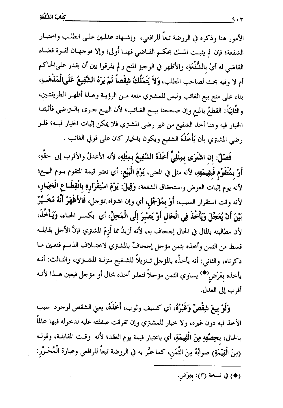 فصْلٌ: إِنِ اشْتَرَى بِمِثْلِيّ أَخَذهُ الشَّفِيعُ بِمِثْلِهِ، لأنه الأعدلُ والأقرب إلى حقِّهِ، أَوْ بِمُتَقَوِّمِ فَبِقِيمَتِهِ، لأنه مثل في المعنى، يَوْمَ الْبَيع، أي تعتبر قيمة المتقوم يوم البيع؛ لأنه يوم إثبات العوض واستحقاق الشفعة، وَقِيلَ: يَوْمَ استِقْرَارِهِ بِانقِطاع الْخِيَارِ، لأنه وقت استقرار السبب، أَوْ بِمُؤَجَّلِ، أي وإن اشتراه بمؤجل، فالأظهَرُ أنهُ مُخَيَّرٌ بَينَ أن يُعَجِّلَ ويأخُذَ في الحَالِ أَوْ يَصْبِرَ إِلَى المَحِلِّ، أي بكسر الحاء، ويأخُذ، لأن مطالبته بالمال في الحال إجحاف به، لأنه أزيدُ مما لَزِمَ المشترى فإنَّ الأجل يقابله قسط من الثمن وأخذه بثمن مؤجل إجحافٌ بالمشترى لاختلاف الذمم فتعين ما ذكرناه، والثاني: أنه يأخذُه بالموجل تنزيلًا للشفيع منزلة المشترى، والثالث: أنه يأخذه بِعَرْضٍ (•) يساوي الثمن مؤجلًا لتعذر أخذه بحال أو موجل فيعين هذا لأنه أقرب إلى العدل.