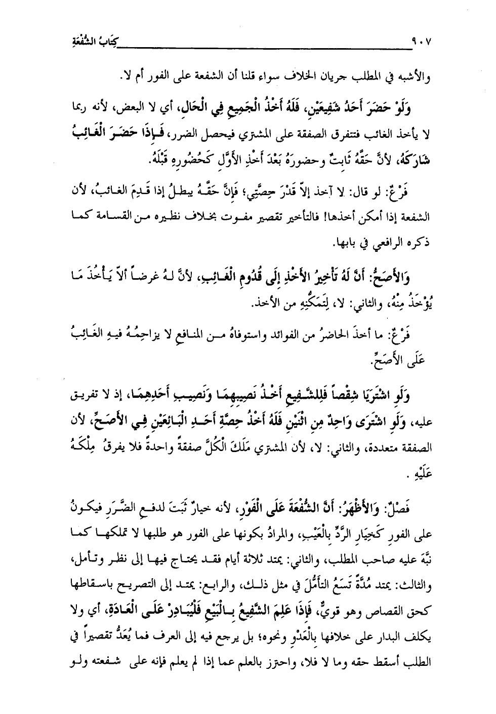 فَصْلٌ: وَالأَظْهَرُ: أَنَّ الشُّفْعَةَ عَلَى الْفَوْرِ، لأنه خيارٌ ثَبَتَ لدفعِ الضَّرَرِ فيكونُ على الفورِ كَخِيَارِ الرَّدِّ بِالْعَيبِ، والمرادُ بكونها على الفور هو طلبها لا تملكها كما نبَّهَ عليه صاحب المطلب، والثاني: يمتد ثلاثة أيام فقد يحتاج فيها إلى نظر وتأمل، والثالث: يمتد مُدَّةً تَسَعُ التأَمُّلَ في مثل ذلك، والرابع: يمتد إلى التصريح بإسقاطها كحق القصاص وهو قويٌّ، فَإِذَا عَلِمَ الشَّفِيعُ بِالْبَيع فَلْيُبَادِرْ عَلَى الْعَادَةِ، أي ولا يكلف البدار على خلافها بِالْعَدْو ونحوه؛ بل يرجع فيه إلى العرف فما يُعَدُّ تقصيرًا في الطلب أسقط حقه وما لا فلا، واحترز بالعلم عما إذا لم يعلم فإنه على شفعته ولو