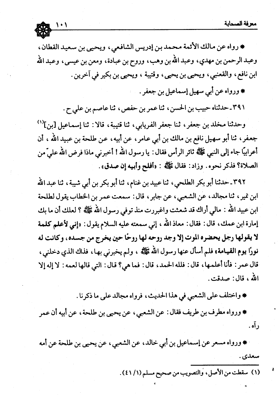 392 - حَدَّثَنَا أَبُو بَكْرٍ الطَّلْحِيُّ، ثَنَا عُبَيْدُ بْنُ غَنَّامٍ، ثَنَا أَبُو بَكْرِ بْنُ أَبِي شَيْبَةَ، ثَنَا عَبْدُ اللهِ بْنُ نُمَيْرٍ، ثَنَا مُجَالِدٌ، عَنِ الشَّعْبِيِّ، عَنْ جَابِرٍ، قَالَ: سَمِعْتُ عُمَرَ بْنَ الْخَطَّابِ، يَقُولُ لِطَلْحَةَ بْنِ عُبَيْدِ اللهِ: مَا لِي أَرَاكَ قَدْ شَعِثْتَ وَاغْبَرَرْتَ مُنْذُ تَوَفِّيَ رَسُولُ اللهِ صَلَّى اللَّهُ عَلَيْهِ وَسَلَّمَ؟ لَعَلَّكَ أَنَّ مَا بِكَ إِمَارَةُ ابْنُ عَمِّكَ، قَالَ: فَقَالَ: مَعَاذَ اللهِ، إِنِّي سَمِعْتُهُ عَلَيْهِ السَّلَامُ يَقُولُ: §«إِنِّي لَأَعْلَمُ كَلِمَةً لَا مَا يَقُولُهَا رَجُلٌ يَحَضْرُهُ الْمَوْتُ إِلَّا وَجَدَ رُوحَهُ لَهَا رُوحًا حِينَ يَخْرُجُ مِنْ جَسَدِهِ، وَكَانَتْ لَهُ نُورًا يَوْمَ الْقِيَامَةِ» فَلَمْ أَسْأَلْ عَنْهَا رَسُولَ اللهِ صَلَّى اللَّهُ عَلَيْهِ وَسَلَّمَ، وَلَمْ يُخْبِرْنِي بِهَا، فَذَاكَ الَّذِي دَخَلَنِي، قَالَ عُمَرُ: فَأَنَا أَعْلَمُهَا، قَالَ: فَلِلَّهِ الْحَمْدُ، قَالَ: فَمَا هِيَ؟ قَالَ: الَّتِي قَالَهَا لِعَمِّهِ: «لَا إِلَهَ إِلَّا اللهُ» قَالَ: صَدَقْتَ " وَاخْتُلِفَ عَلَى الشَّعْبِيِّ فِي هَذَا الْحَدِيثِ فَرَوَاهُ مُجَالِدٌ عَلَى مَا ذَكَرْنَا، وَرَوَاهُ مُطَرِّفُ بْنُ طَرِيفٍ، فَقَالَ عَنِ الشَّعْبِيِّ، عَنْ يَحْيَى بْنِ طَلْحَةَ، عَنْ أَبِيهِ أَنَّ عُمَرَ رَآهُ، وَرَوَاهُ مِسْعَرٌ عَنْ إِسْمَاعِيلَ بْنِ أَبِي خَالِدٍ، عَنِ الشَّعْبِيِّ، عَنْ يَحْيَى بْنِ طَلْحَةَ، عَنْ أُمِّهِ سُعْدَى، -[102]- وَرَوَاهُ شُعْبَةُ عَنْ إِسْمَاعِيلَ، عَنِ الشَّعْبِيِّ، عَنْ رَجُلٍ، عَنْ سُعْدَى، وَلَمْ يَذْكُرْ يَحْيَى بْنَ طَلْحَةَ، وَرَوَاهُ مَنْصُورُ بْنُ الْمُعْتَمِرِ، عَنْ أَبِي وَائِلٍ، قَالَ: حُدِّثْتُ أَنَّ أَبَا بَكْرٍ لَقِيَ طَلْحَةَ، فَقَالَ: مَالِي أَرَاكَ وَاجِمًا "