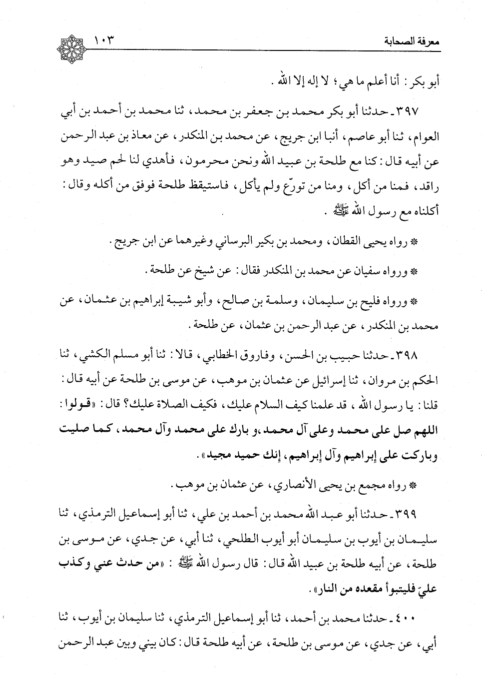 399 - حَدَّثَنَا أَبُو عَبْدِ اللهِ مُحَمَّدُ بْنُ أَحْمَدَ بْنِ عَلِيٍّ، ثَنَا أَبُو إِسْمَاعِيلَ التِّرْمِذِيُّ، ثَنَا سُلَيْمَانُ بْنُ أَيُّوبَ بْنِ سُلَيْمَانَ أَبُو أَيُّوبَ الطَّلْحِيُّ، ثَنَا أَبِي، عَنْ جَدِّي، عَنْ مُوسَى بْنِ طَلْحَةَ، عَنْ أَبِيهِ طَلْحَةَ بْنِ عُبَيْدِ اللهِ، قَالَ: قَالَ رَسُولُ اللهِ صَلَّى اللَّهُ عَلَيْهِ وَسَلَّمَ: §«مَنْ حَدَّثَ عَنِّي وَكَذَبَ عَلَيَّ فَلْيَتَبَوَّأْ مَقْعَدَهُ مِنَ النَّارِ»