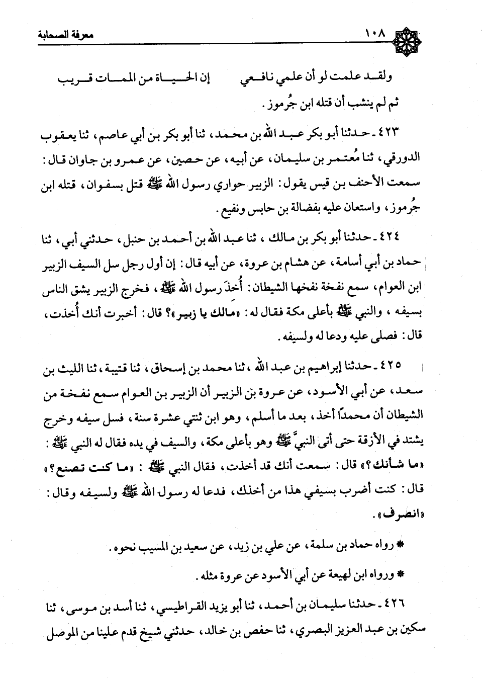 426 - حَدَّثَنَا سُلَيْمَانُ بْنُ أَحْمَدَ ثَنَا أَبُو يَزِيدَ الْقَرَاطِيسِيُّ، ثَنَا أَسَدُ بْنُ مُوسَى، ثَنَا سِكِّينُ بْنُ عَبْدِ الْعَزِيزِ الْبَصْرِيُّ، ثَنَا حَفْصُ بْنُ خَالِدٍ، حَدَّثَنِي شَيْخٌ، قَدِمَ عَلَيْنَا مِنَ الْمَوْصِلِ، -[109]- قَالَ: §" صَحِبْتُ الزُّبَيْرَ بْنَ الْعَوَّامِ فِي بَعْضِ أَسْفَارِهِ فَأَصَابَتْهُ جَنَابَةٌ بِأَرْضِ قَفْرٍ، فَقَالَ: اسْتُرْنِي، فَسَتَرْتُهُ فَحَانَتْ مِنِّي إِلَيْهِ الْتِفَاتَةٌ، فَرَأَيْتُهُ مُجَدَّعًا بِالسُّيُوفِ، قُلْتُ: وَاللهِ لَقَدْ رَأَيْتُ بِكَ آثَارًا مَا رَأَيْتُهَا بِأَحَدٍ قَطُّ، قَالَ: وَقَدْ رَأَيْتَ ذَاكَ؟ قُلْتُ: نَعَمْ، قَالَ: أَمَا وَاللهِ مَا مِنَهَا جِرَاحَةٌ إِلَّا مَعَ رَسُولِ اللهِ صَلَّى اللَّهُ عَلَيْهِ وَسَلَّمَ وَفِي سَبِيلِ اللهِ عَزَّ وَجَلَّ "
