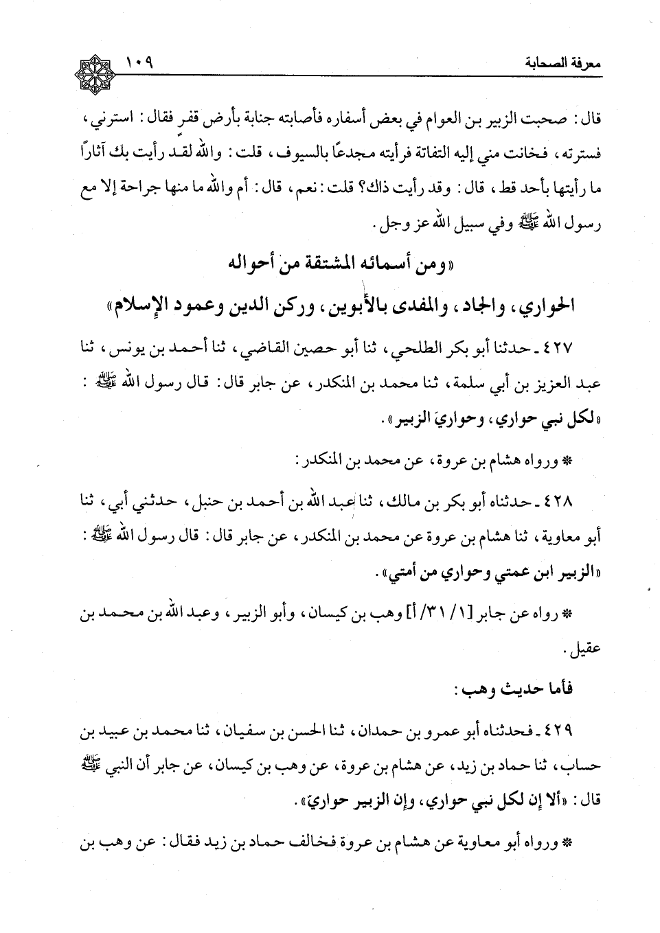 429 - فَأَمَّا حَدِيثُ وَهْبٍ فَحَدَّثْنَاهُ أَبُو عَمْرِو بْنُ حَمْدَانَ، ثَنَا الْحَسَنُ بْنُ سُفْيَانَ، ثَنَا مُحَمَّدُ بْنُ عُبَيْدِ بْنِ حَسَّابٍ، حَدَّثَنَا حَمَّادُ بْنُ زَيْدٍ، عَنْ هِشَامِ بْنِ عُرْوَةَ، عَنْ وَهْبِ بْنِ كَيْسَانَ، عَنْ جَابِرٍ، أَنَّ النَّبِيَّ صَلَّى اللَّهُ عَلَيْهِ وَسَلَّمَ قَالَ: §«أَلَا إِنَّ لِكُلِّ نَبِيٍّ حَوَارِيًّا، وَإِنَّ الزُّبَيْرَ حَوَارِيَّ» وَرَوَاهُ أَبُو مُعَاوِيَةَ، عَنْ هِشَامِ بْنِ عُرْوَةَ فَخَالَفَ حَمَّادَ بْنَ زَيْدٍ، فَقَالَ: عَنْ وَهْبِ بْنِ -[110]- كَيْسَانَ، عَنْ عَبْدِ اللهِ بْنِ الزُّبَيْرِ، وَأَمَّا حَدِيثُ أَبِي الزُّبَيْرِ