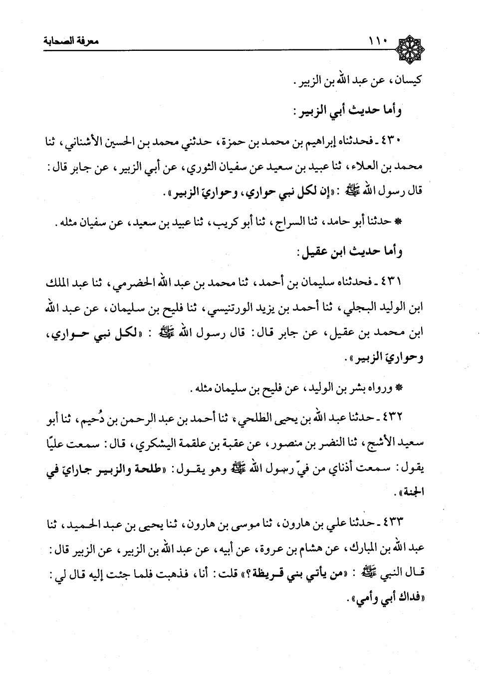 430 - فَحَدَّثْنَاهُ إِبْرَاهِيمُ بْنُ مُحَمَّدِ بْنِ حَمْزَةَ، حَدَّثَنِي مُحَمَّدُ بْنُ الْحُسَيْنِ الْأُشْنَانِيُّ، ثَنَا مُحَمَّدُ بْنُ الْعَلَاءِ، ثَنَا عُبَيْدُ بْنُ سَعِيدٍ، عَنْ سُفْيَانَ الثَّوْرِيِّ، عَنْ أَبِي الزُّبَيْرِ، عَنْ جَابِرٍ، قَالَ: قَالَ رَسُولُ اللهِ صَلَّى اللَّهُ عَلَيْهِ وَسَلَّمَ: §«إِنَّ لِكُلِّ نَبِيٍّ حَوَارِيًّا، وَحَوَارِيَّ الزُّبَيْرُ» حَدَّثَنَا أَبُو حَامِدٍ، ثَنَا السَّرَّاجُ، ثَنَا أَبُو كُرَيْبٍ، ثَنَا عُبَيْدُ بْنُ سَعِيدٍ، عَنْ سُفْيَانَ مِثْلَهُ وَأَمَّا حَدِيثُ ابْنِ عَقِيلٍ
