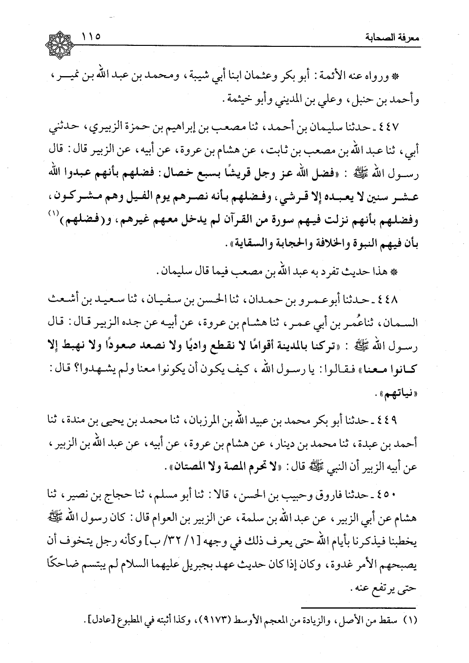 447 - حَدَّثَنَا سُلَيْمَانُ بْنُ أَحْمَدَ، ثَنَا مُصْعَبُ بْنُ إِبْرَاهِيمَ بْنِ حَمْزَةَ الزُّبَيْرِيُّ، حَدَّثَنِي أَبِي ثَنَا عَبْدُ اللهِ بْنُ مُصْعَبِ بْنِ ثَابِتٍ، عَنْ هِشَامِ بْنِ عُرْوَةَ، عَنْ أَبِيهِ، عَنِ الزُّبَيْرِ، قَالَ: قَالَ رَسُولُ اللهِ صَلَّى اللَّهُ عَلَيْهِ وَسَلَّمَ: §" فَضَّلَ اللهُ عَزَّ وَجَلَّ قُرَيْشًا بِسَبْعِ خِصَالٍ: فَضَّلَهُمْ بِأَنَّهُمْ عَبْدُوا اللهَ عَشْرَ سِنِينَ، لَا يَعْبُدُهُ إِلَّا قُرَشِيٌّ، وَفَضَّلَهُمْ بِأَنَّهُ نَصْرَهُمْ يَوْمَ الْفِيلِ وَهُمْ مُشْرِكُونَ، وَفَضَّلَهُمْ بِأَنَّهُمْ نَزَلَتْ فِيهِمْ سُورَةٌ مِنَ الْقُرْآنِ لَمْ يَدْخُلْ مَعَهُمْ غَيْرُهُمْ، وَفَضَّلَهُمْ بِأَنَّ فِيهِمُ النُّبُوَّةَ، وَالْخِلَافَةَ وَالْحِجَابَةَ، وَالسِّقَايَةَ " هَذَا حَدِيثٌ تَفَرَّدَ بِهِ عَبْدُ اللهِ بْنُ مُصْعَبٍ فِيمَا قَالَ سُلَيْمَانُ