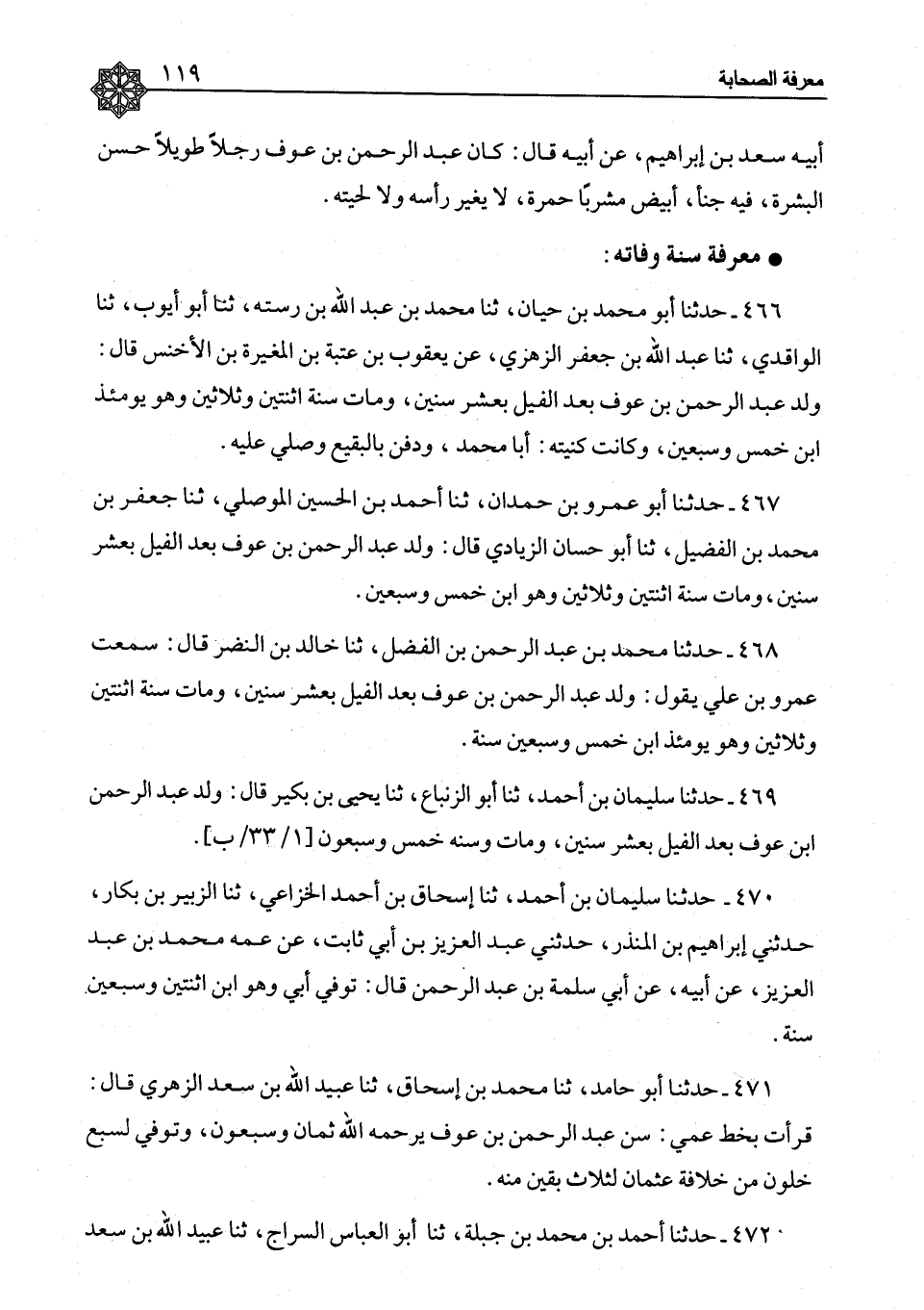 467 - حَدَّثَنَا أَبُو عَمْرِو بْنُ حَمْدَانَ، ثَنَا أَحْمَدُ بْنُ الْحُسَيْنِ الْمَوْصِلِيُّ، ثَنَا جَعْفَرُ بْنُ مُحَمَّدِ بْنِ الْفُضَيْلِ، ثَنَا أَبُو حَسَّانَ الزِّيَادِيُّ، قَالَ: «§وُلِدَ عَبْدُ الرَّحْمَنِ بْنُ عَوْفٍ بَعْدَ الْفِيلِ بِعَشْرِ سِنِينَ، وَمَاتَ سَنَةَ اثْنَتَيْنِ وَثَلَاثِينَ، وَهُوَ ابْنُ خَمْسٍ وَسَبْعِينَ»