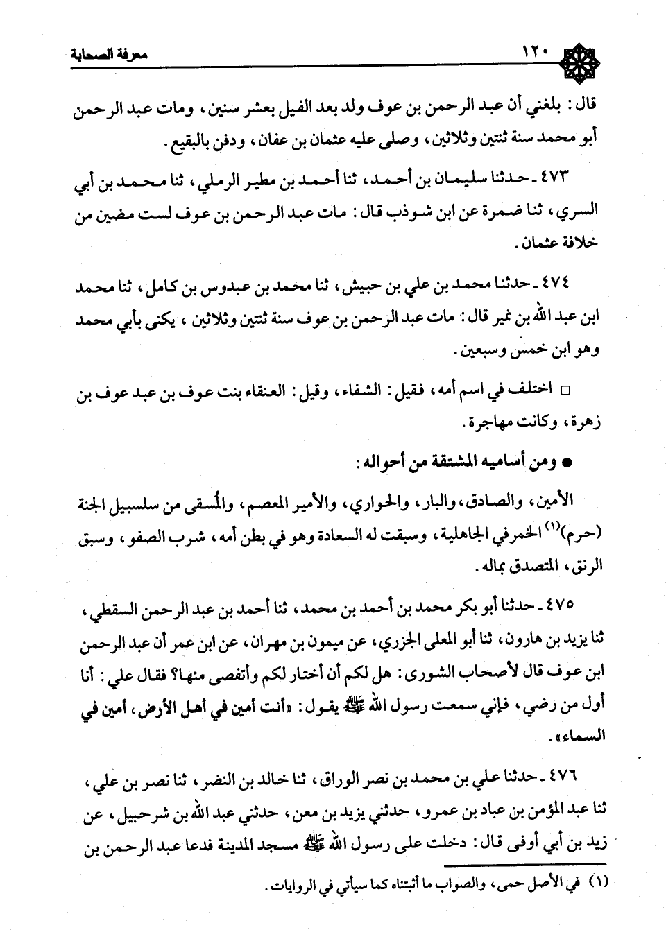 474 - حَدَّثَنَا مُحَمَّدُ بْنُ عَلِيِّ بْنِ حُبَيْشٍ، ثَنَا مُحَمَّدُ بْنُ عَبْدُوسِ بْنِ كَامِلٍ، ثَنَا مُحَمَّدُ بْنُ عَبْدِ اللهِ بْنِ نُمَيْرٍ، قَالَ: §«مَاتَ عَبْدُ الرَّحْمَنِ بْنُ عَوْفٍ سَنَةَ ثِنْتَيْنِ وَثَلَاثِينَ يُكْنَى بِأَبِي مُحَمَّدٍ، وَهُوَ ابْنُ خَمْسٍ وَسَبْعِينَ» اخْتُلِفَ فِي اسْمِ أُمِّهِ، فَقِيلَ: الشِّفَّاءُ وَقِيلَ: الْعَنْقَاءُ بِنْتُ عَوْفِ بْنِ عَبْدِ عَوْفِ بْنِ زُهْرَةَ وَكَانَتْ مُهَاجِرَةً، وَمِنْ أَسَامِيهِ الْمُشْتَقَّةِ مِنْ أَحْوَالِهِ: الْأَمِينُ، وَالصَّادِقُ، وَالْبَارُّ، وَالْحَوَارِيُّ، وَالْأَمِيرُ الْمُعْصِمُ، وَالْمُسْقَى مِنْ سَلْسَبِيلِ الْجَنَّةِ، حَرَّمَ الْخَمْرَ فِي الْجَاهِلِيَّةِ، وَسَبَقَتْ لَهُ السَّعَادَةُ وَهُوَ فِي بَطْنِ أُمِّهِ، شَرِبَ الصَّفْوَ وَسَبَقَ الرَّنْقَ الْمُتَصَدِّقُ بِمَالِهِ
