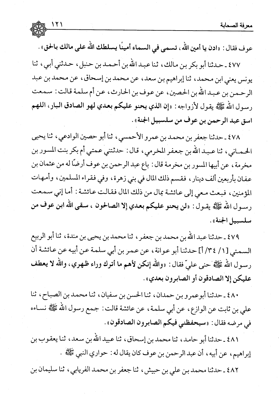 477 - حَدَّثَنَا أَبُو بَكْرِ بْنُ مَالِكٍ، ثَنَا عَبْدُ اللهِ بْنُ أَحْمَدَ بْنِ حَنْبَلٍ، حَدَّثَنِي أَبِي، ثَنَا يُونُسُ يَعْنِي ابْنَ مُحَمَّدٍ، ثَنَا إِبْرَاهِيمُ بْنُ سَعْدٍ، عَنْ مُحَمَّدِ بْنِ إِسْحَاقَ، عَنْ مُحَمَّدِ بْنِ عَبْدِ الرَّحْمَنِ بْنِ عَبْدِ اللهِ بْنِ الْحُصَيْنِ، عَنْ عَوْفِ بْنِ الْحَارِثِ، عَنْ أُمِّ سَلَمَةَ، قَالَتْ: سَمِعْتُ رَسُولَ اللهِ صَلَّى اللَّهُ عَلَيْهِ وَسَلَّمَ يَقُولُ لِأَزْوَاجِهِ: «إِنَّ §الَّذِي يَحْنُو عَلَيْكُمْ بَعْدِي لَهُوَ الصَّادِقُ الْبَارُّ، اللهُمَّ اسْقِ عَبْدَ الرَّحْمَنِ بْنَ عَوْفٍ مِنْ سَلْسَبِيلِ الْجَنَّةِ»