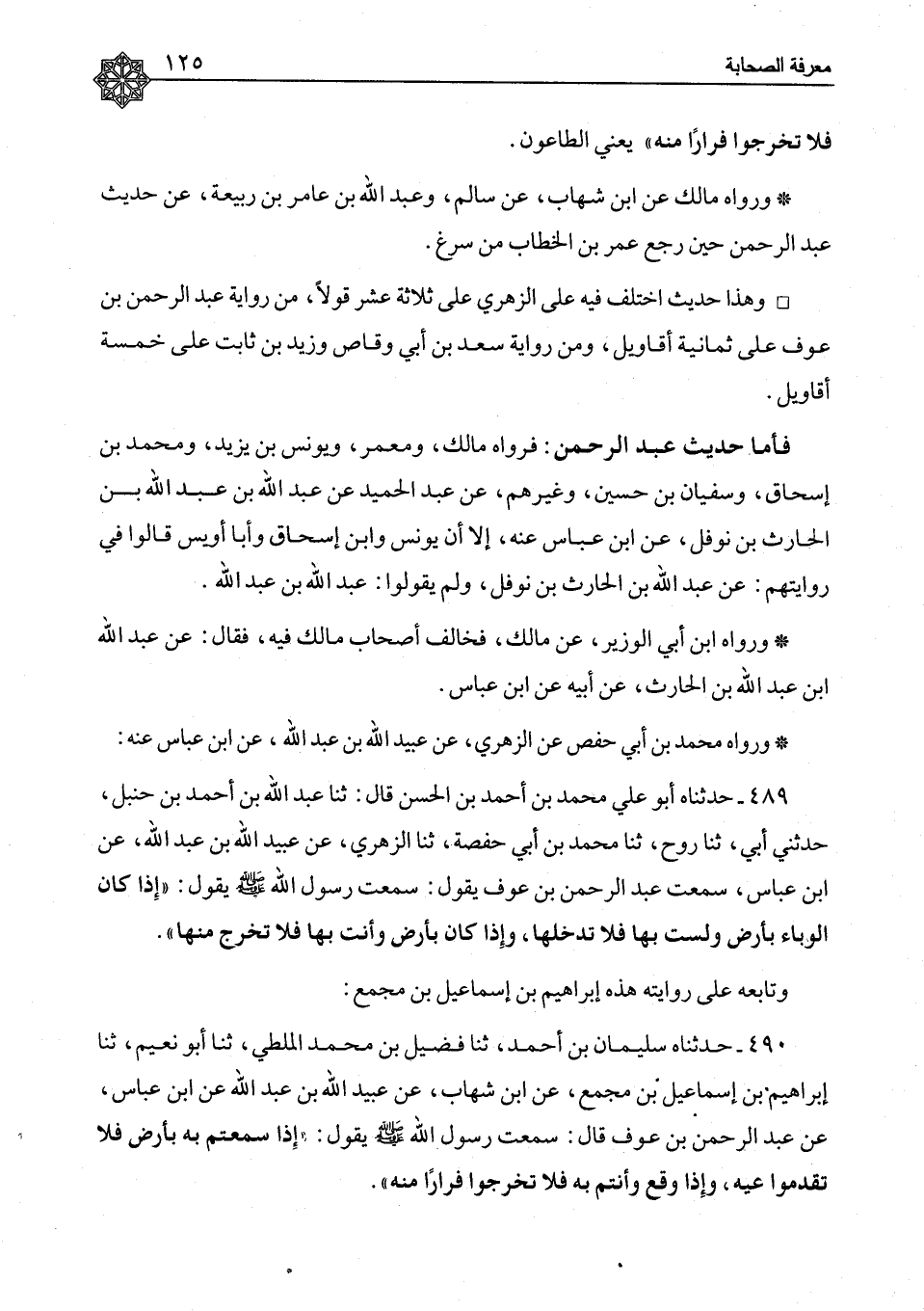 470 - حَدَّثَنَاهُ سُلَيْمَانُ بْنُ أَحْمَدَ، ثَنَا فُضَيْلُ بْنُ مُحَمَّدِ الْمَلَطِيُّ، ثَنَا أَبُو نُعَيْمٍ، ثَنَا إِبْرَاهِيمُ بْنُ إِسْمَاعِيلَ بْنِ مُجَمِّعٍ، عَنِ ابْنِ شِهَابٍ، عَنْ عُبَيْدِ اللهِ بْنِ عَبْدِ اللهِ، عَنِ ابْنِ عَبَّاسٍ، عَنْ عَبْدِ الرَّحْمَنِ بْنِ عَوْفٍ، قَالَ: سَمِعْتُ رَسُولَ اللهِ صَلَّى اللَّهُ عَلَيْهِ وَسَلَّمَ يَقُولُ: «§إِذَا سَمِعْتُمْ بِهِ بِأَرْضٍ فَلَا تَقْدِمُوا عَلَيْهِ، وَإِذَا وَقَعَ وَأَنْتُمْ بِهِ فَلَا تَخْرُجُوا فِرَارًا مِنْهُ» -[126]- وَرَوَاهُ سُفْيَانُ بْنُ حُسَيْنٍ عَنِ الزُّهْرِيِّ، عَنْ سَالِمٍ، عَنْ أَبِيهِ، عَنْ عَبْدِ الرَّحْمَنِ