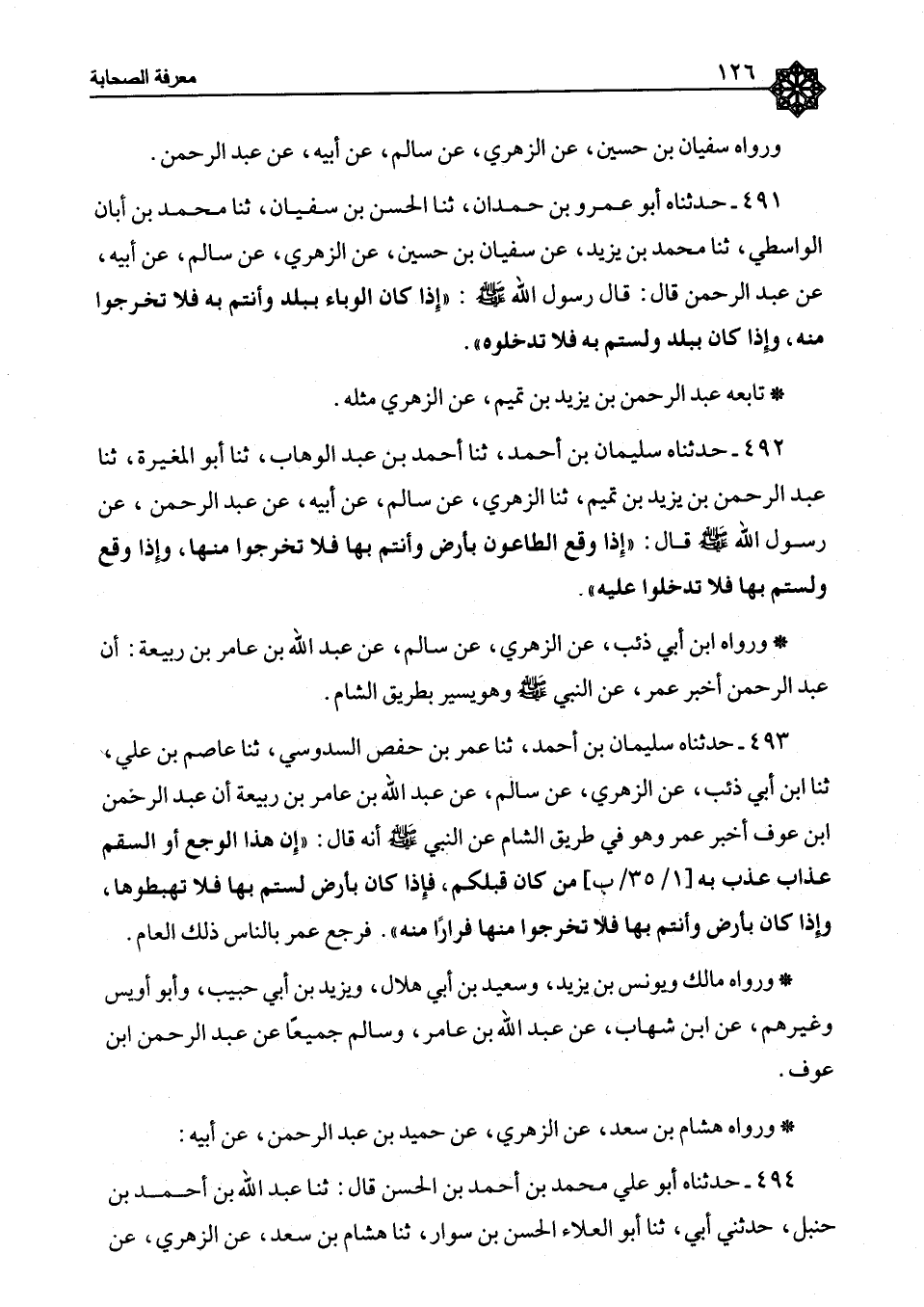 491 - حَدَّثَنَاهُ أَبُو عَمْرِو بْنُ حَمْدَانَ، ثَنَا الْحَسَنُ بْنُ سُفْيَانَ، ثَنَا مُحَمَّدُ بْنُ أَبَانَ الْوَاسِطِيُّ، ثَنَا مُحَمَّدُ بْنُ يَزِيدَ، عَنْ سُفْيَانَ بْنِ حُسَيْنٍ، عَنِ الزُّهْرِيِّ، عَنْ سَالِمٍ، عَنْ أَبِيهِ، عَنْ عَبْدِ الرَّحْمَنِ، قَالَ: قَالَ رَسُولُ اللهِ صَلَّى اللَّهُ عَلَيْهِ وَسَلَّمَ: " §إِذَا كَانَ الْوَبَاءُ بِبَلَدٍ وَأَنْتُمْ بِهِ فَلَا تَخْرُجُوا مِنْهُ، وَإِذَا كَانَ بِبَلَدٍ وَلَسْتُمْ بِهِ فَلَا تَدْخُلُوهُ تَابَعَهُ عَبْدُ الرَّحْمَنِ بْنُ يَزِيدَ بْنِ تَمِيمٍ، عَنِ الزُّهْرِيِّ مِثْلَهُ