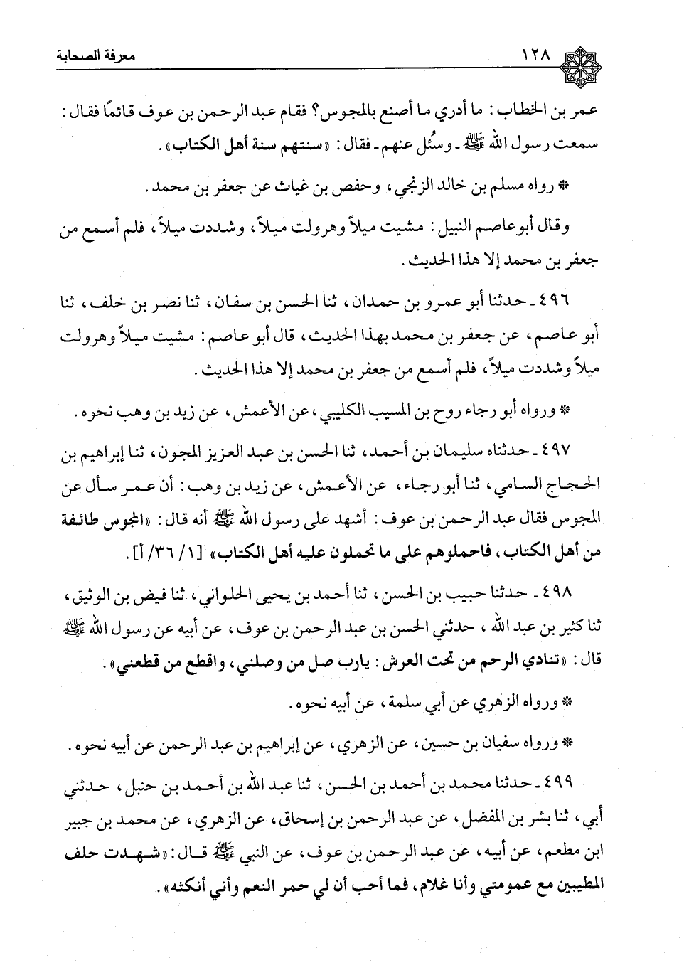 499 - حَدَّثَنَا مُحَمَّدُ بْنُ أَحْمَدَ بْنِ الْحَسَنِ، ثَنَا عَبْدُ اللهِ بْنُ أَحْمَدَ بْنِ حَنْبَلٍ، حَدَّثَنِي أَبِي، ثَنَا بِشْرُ بْنُ الْمُفَضَّلِ، عَنْ عَبْدِ الرَّحْمَنِ بْنِ إِسْحَاقَ، عَنِ الزُّهْرِيِّ، عَنْ مُحَمَّدِ بْنِ جُبَيْرِ بْنِ مُطْعِمٍ، عَنْ أَبِيهِ، عَنْ عَبْدِ الرَّحْمَنِ بْنِ عَوْفٍ، عَنِ النَّبِيِّ صَلَّى اللَّهُ عَلَيْهِ وَسَلَّمَ، قَالَ: §«شَهِدْتُ حِلْفَ الْمُطَيَّبِينَ مَعَ عُمُومَتِي وَأَنَا غُلَامٌ فَمَا أُحِبُّ أَنَّ لِي حُمْرَ النَّعَمِ وَأَنِّي أَنْكُثُهُ» -[129]- رَوَاهُ إِسْمَاعِيلُ ابْنُ عُلَيَّةَ، وَخَالِدٌ الْوَاسِطِيُّ، عَنْ عَبْدِ الرَّحْمَنِ بْنِ إِسْحَاقَ مِثْلَهُ