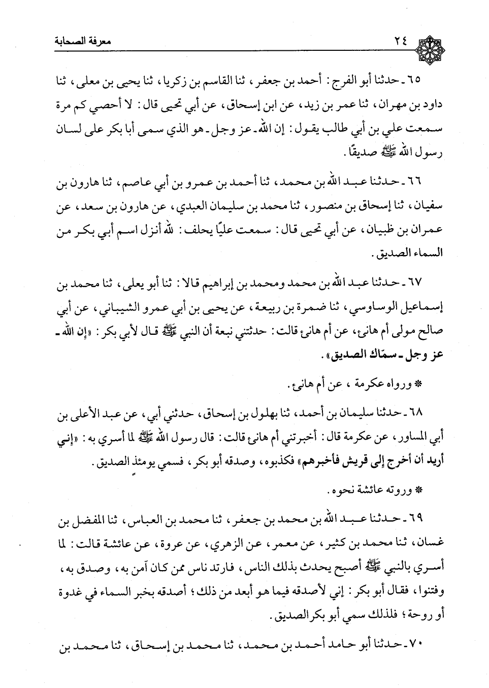 67 - حَدَّثَنَا عَبْدُ اللهِ بْنُ مُحَمَّدٍ، وَمُحَمَّدُ بْنُ إِبْرَاهِيمَ، قَالَا: ثَنَا أَبُو يَعْلَى، ثَنَا مُحَمَّدُ بْنُ إِسْمَاعِيلَ الْوَسَاوِسِيُّ، ثَنَا ضَمْرَةُ بْنُ رَبِيعَةَ، عَنْ يَحْيَى بْنِ أَبِي عَمْرٍو السَّيْبَانِيِّ، عَنْ أَبِي صَالِحٍ، مَوْلَى أُمِّ هَانِئٍ، عَنْ أُمِّ هَانِئٍ، قَالَتْ: حَدَّثَتْنِي نَبْعَةُ، " أَنَّ النَّبِيَّ صَلَّى اللَّهُ عَلَيْهِ وَسَلَّمَ قَالَ لِأَبِي بَكْرٍ: «إِنَّ §اللهَ عَزَّ وَجَلَّ سَمَّاكَ الصِّدِّيقَ» وَرَوَاهُ عِكْرِمَةُ عَنْ أُمِّ هَانِئٍ