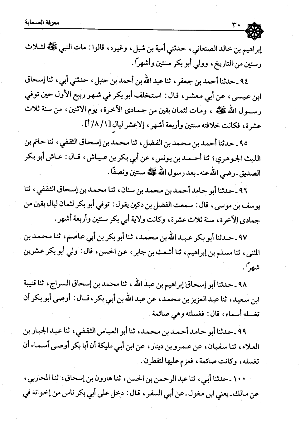 96 - حَدَّثَنَا أَبُو حَامِدٍ أَحْمَدُ بْنُ مُحَمَّدِ بْنِ سِنَانٍ، ثَنَا مُحَمَّدُ بْنُ إِسْحَاقَ الثَّقَفِيُّ، ثَنَا يُوسُفُ بْنُ مُوسَى بْنِ سِنَانٍ، حَدَّثَنَا مُحَمَّدُ بْنُ إِسْحَاقَ الثَّقَفِيُّ، حَدَّثَنَا يُوسُفُ بْنُ مُوسَى، قَالَ: سَمِعْتُ الْفَضْلَ بْنَ دُكَيْنٍ، يَقُولُ: §«تُوُفِّيَ أَبُو بَكْرٍ لِثَمَانِ لَيَالٍ بَقِينَ مِنْ جُمَادَى الْآخِرَةِ سَنَةَ ثَلَاثَ عَشْرَةَ وَكَانَتْ وِلَايَةُ أَبِي بَكْرٍ سَنَتَيْنِ وَأَرْبَعَةَ أَشْهُرٍ»