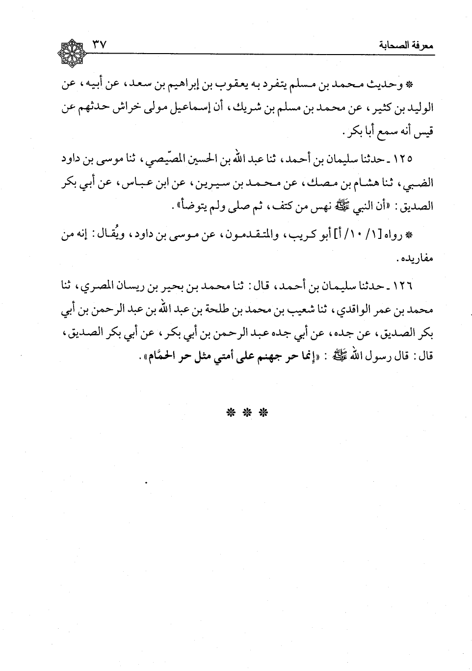 126 - حَدَّثَنَا سُلَيْمَانُ بْنُ أَحْمَدَ، قَالَ: ثَنَا مُحَمَّدُ بْنُ بُحَيْرِ بْنِ رَيْسَانَ الْمِصْرِيُّ، ثَنَا مُحَمَّدُ بْنُ عُمَرَ الْوَاقِدِيُّ، ثَنَا شُعَيْبُ بْنُ مُحَمَّدِ بْنِ طَلْحَةَ بْنِ عَبْدِ اللهِ بْنِ عَبْدِ الرَّحْمَنِ بْنِ أَبِي بَكْرٍ الصِّدِّيقِ، عَنْ جَدِّهِ، عَنْ أَبِي جَدِّهِ عَبْدِ الرَّحْمَنِ بْنِ أَبِي بَكْرٍ، عَنْ أَبِي بَكْرٍ الصِّدِّيقِ، قَالَ: قَالَ رَسُولُ اللهِ صَلَّى اللَّهُ عَلَيْهِ وَسَلَّمَ: «إِنَّمَا §حَرُّ جَهَنَّمَ عَلَى أُمَّتِي مِثْلُ حَرِّ الْحَمَّامِ»