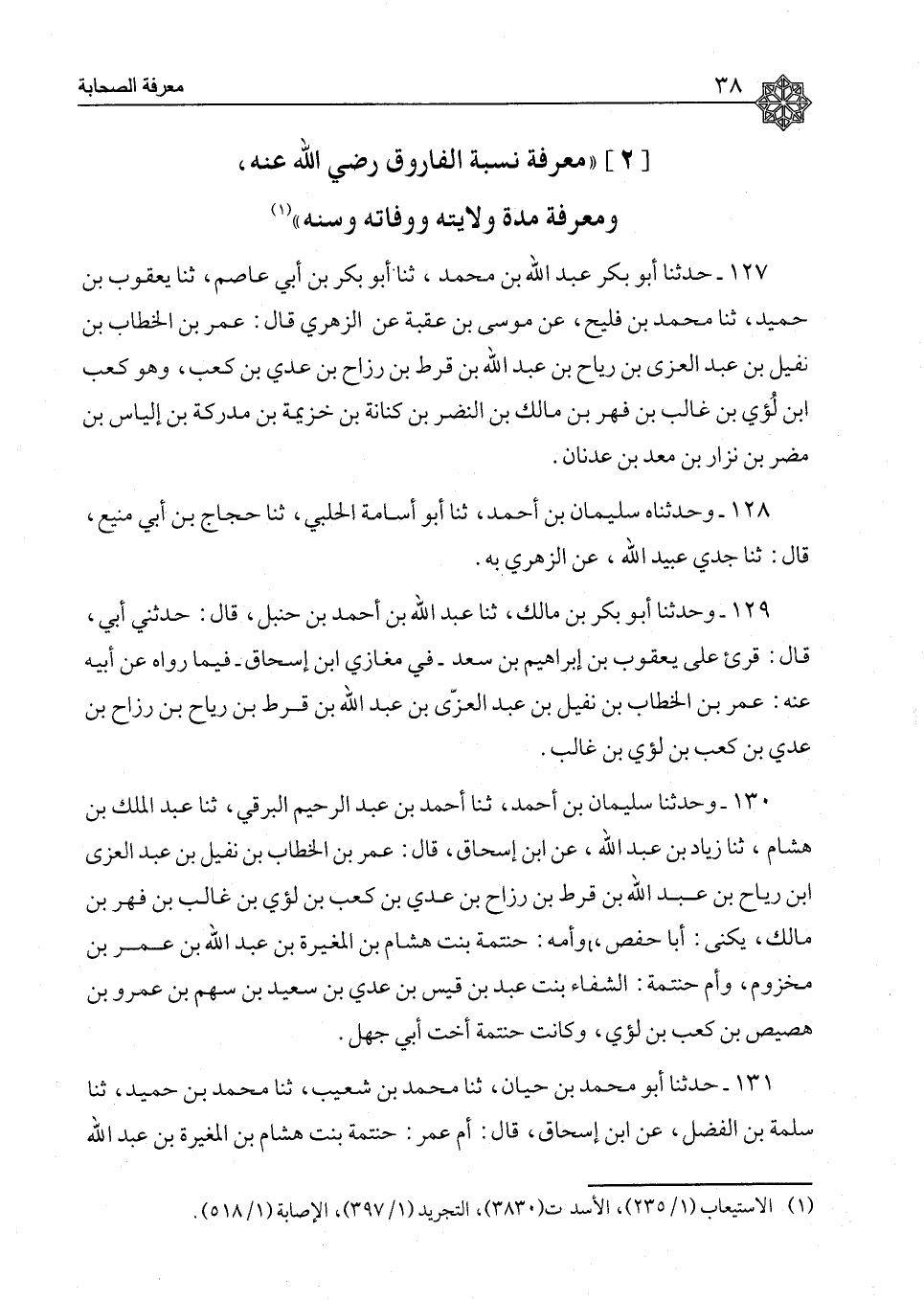 127 - حَدَّثَنَا أَبُو بَكْرٍ عَبْدُ اللهِ بْنُ مُحَمَّدٍ، ثَنَا أَبُو بَكْرِ بْنُ أَبِي عَاصِمٍ، ثَنَا يَعْقُوبُ بْنُ حُمَيْدٍ، ثَنَا مُحَمَّدُ بْنُ فُلَيْحٍ، عَنْ مُوسَى بْنِ عُقْبَةَ، عَنِ الزُّهْرِيِّ، قَالَ: §«عُمَرُ بْنُ الْخَطَّابِ بْنِ نُفَيْلِ بْنِ عَبْدِ الْعُزَّى بْنِ رِيَاحِ بْنِ عَبْدِ اللهِ بْنِ قُرْطِ بْنِ رَزَاحِ بْنِ عَدِيِّ بْنِ كَعْبٍ، وَهُوَ كَعْبُ بْنُ لُؤَيِّ بْنِ غَالِبِ بْنِ فِهْرِ بْنِ مَالِكِ بْنِ النَّضْرِ بْنِ كِنَانَةَ بْنِ خُزَيْمَةَ بْنِ مُدْرِكَةَ بْنَ إِلْيَاسَ بْنَ مُضَرَ بْنِ نِزَارِ بْنِ مَعْدِ بْنِ عَدْنَانَ»