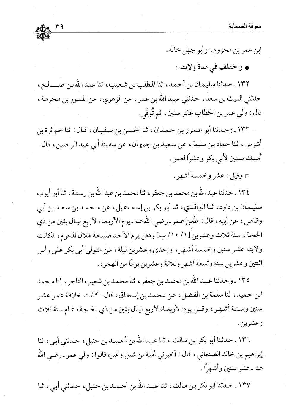 136 - حَدَّثَنَا أَبُو بَكْرِ بْنُ مَالِكٍ، ثَنَا عَبْدُ اللهِ بْنُ أَحْمَدَ بْنِ حَنْبَلٍ، حَدَّثَنِي أَبِي، ثَنَا إِبْرَاهِيمُ بْنُ خَالِدٍ الصَّنْعَانِيُّ، قَالَ: أَخْبَرَنِي أُمَيَّةُ بْنُ شِبْلٍ وَغَيْرُهُ قَالُوا: §«وَلِيَ عُمَرُ رَضِيَ اللهُ عَنْهُ عَشْرَ سِنِينَ وَأَشْهُرًا»