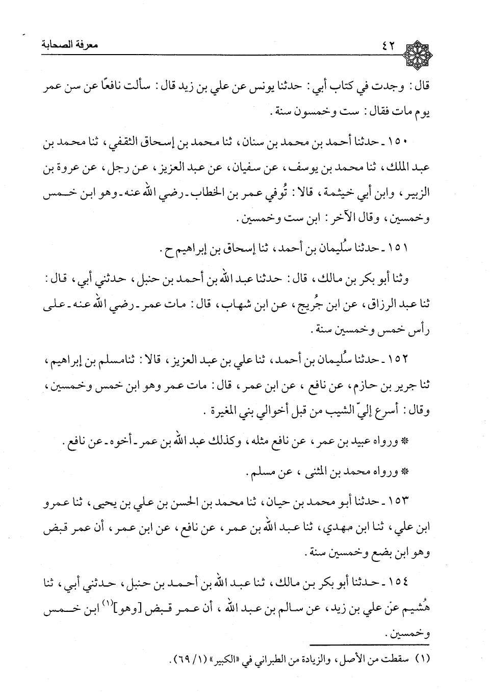 151 - حَدَّثَنَا سُلَيْمَانُ بْنُ أَحْمَدَ، ثَنَا إِسْحَاقُ بْنُ إِبْرَاهِيمَ، ح وثَنَا أَبُو بَكْرِ بْنُ مَالِكٍ، قَالَ: حَدَّثَنَا عَبْدُ اللهِ بْنُ أَحْمَدَ بْنِ حَنْبَلٍ، حَدَّثَنِي أَبِي قَالَا: ثَنَا عَبْدُ الرَّزَّاقِ، عَنِ ابْنِ جُرَيْجٍ، عَنِ ابْنِ شِهَابٍ، قَالَ: §«مَاتَ عُمَرُ رَضِيَ اللهُ عَنْهُ عَلَى رَأْسِ خَمْسٍ وَخَمْسِينَ سَنَةً»
