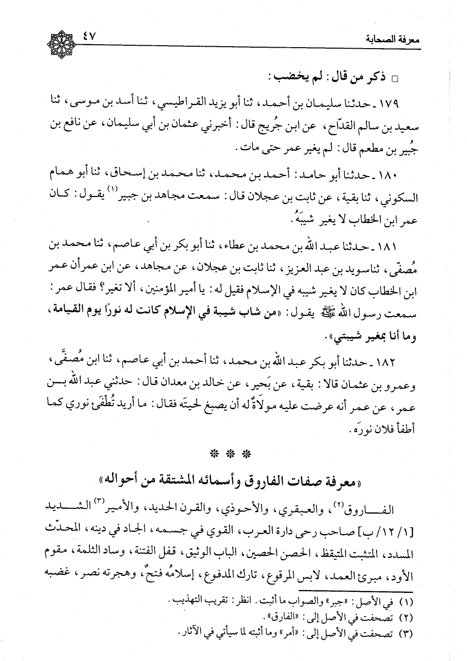 180 - حَدَّثَنَا أَبُو حَامِدٍ أَحْمَدُ بْنُ مُحَمَّدٍ، ثَنَا مُحَمَّدُ بْنُ إِسْحَاقَ، ثَنَا أَبُو هَمَّامٍ السَّكُونِيُّ، ثَنَا بَقِيَّةُ، عَنْ ثَابِتِ بْنِ عَجْلَانَ، قَالَ: سَمِعْتُ مُجَاهِدَ بْنَ جُبَيْرٍ، يَقُولُ: §«كَانَ عُمَرُ بْنُ الْخَطَّابِ لَا يُغَيِّرُ شَيْبَهُ»